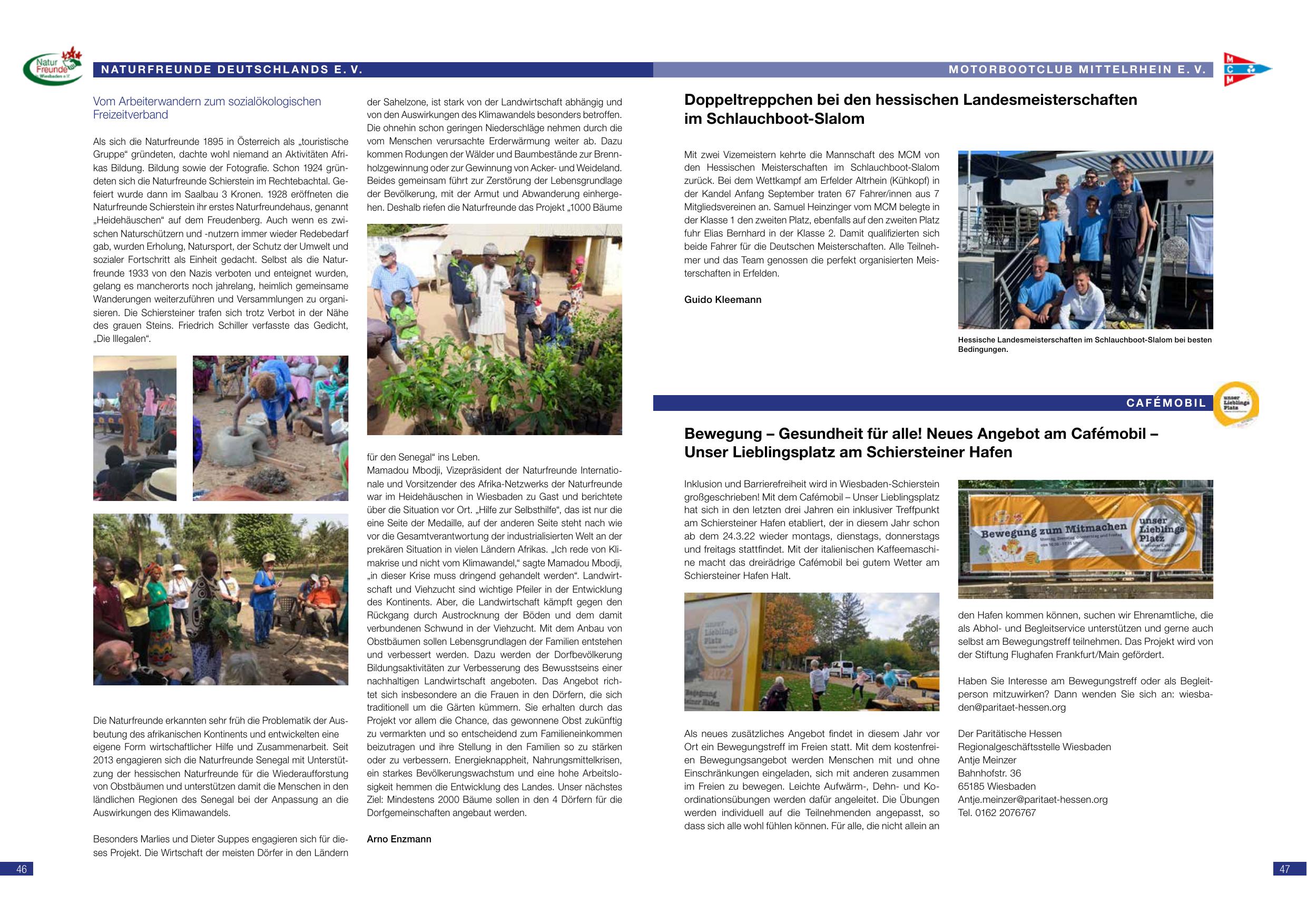 Vom Arbeiterwandern zum sozialökologischen der Sahelzone, ist stark von der Landwirtschaft abhängig und Doppeltreppchen bei den hessischen Landesmeisterschaften Freizeitverband von den Auswirkungen des Klimawandels besonders betroffen. im Schlauchboot-Slalom Die ohnehin schon geringen Niederschläge nehmen durch die Als sich die Naturfreunde 1895 in Österreich als „touristische vom Menschen verursachte Erderwärmung weiter ab. Dazu Gruppe“ gründeten, dachte wohl niemand an Aktivitäten Afri- kommen Rodungen der Wälder und Baumbestände zur Brenn- Mit zwei Vizemeistern kehrte die Mannschaft des MCM von kas Bildung. Bildung sowie der Fotografie. Schon 1924 grün- holzgewinnung oder zur Gewinnung von Acker- und Weideland. den Hessischen Meisterschaften im Schlauchboot-Slalom deten sich die Naturfreunde Schierstein im Rechtebachtal. Ge- Beides gemeinsam führt zur Zerstörung der Lebensgrundlage zurück. Bei dem Wettkampf am Erfelder Altrhein (Kühkopf) in feiert wurde dann im Saalbau 3 Kronen. 1928 eröffneten die der Bevölkerung, mit der Armut und Abwanderung einherge- der Kandel Anfang September traten 67 Fahrer/innen aus 7 Naturfreunde Schierstein ihr erstes Naturfreundehaus, genannt hen. Deshalb riefen die Naturfreunde das Projekt „1000 Bäume Mitgliedsvereinen an. Samuel Heinzinger vom MCM belegte in „Heidehäuschen“ auf dem Freudenberg. Auch wenn es zwi- der Klasse 1 den zweiten Platz, ebenfalls auf den zweiten Platz schen Naturschützern und -nutzern immer wieder Redebedarf fuhr Elias Bernhard in der Klasse 2. Damit qualifizierten sich gab, wurden Erholung, Natursport, der Schutz der Umwelt und beide Fahrer für die Deutschen Meisterschaften. Alle Teilneh- sozialer Fortschritt als Einheit gedacht. Selbst als die Natur- mer und das Team genossen die perfekt organisierten Meis- freunde 1933 von den Nazis verboten und enteignet wurden, terschaften in Erfelden. gelang es mancherorts noch jahrelang, heimlich gemeinsame Wanderungen weiterzuführen und Versammlungen zu organi- Guido Kleemann sieren. Die Schiersteiner trafen sich trotz Verbot in der Nähe des grauen Steins. Friedrich Schiller verfasste das Gedicht, „Die Illegalen“. Hessische Landesmeisterschaften im Schlauchboot-Slalom bei besten Bedingungen.