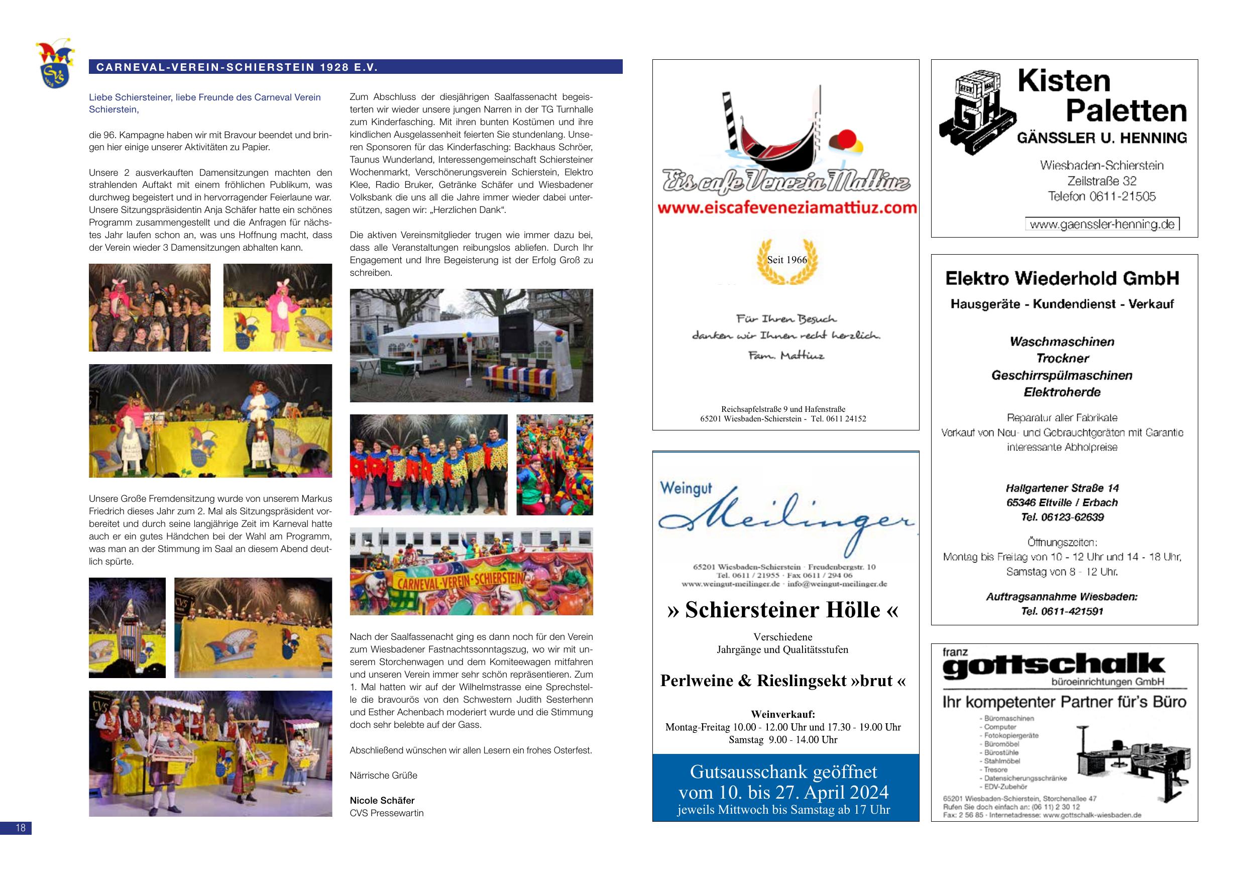 Liebe Schiersteiner und Freunde des Carneval Vereins Schierstein. Die 96. Kampagne haben wir mit Bravour beerbt und bringen wir einige unserer Aktivitäten für Sie. Unsere 3 auswärtigen Darbietungen machten den denkwürdigen Auftakt mit einer köstlichen Polonäse. Viele der verschiedenen Kinderfastnachtsveranstaltungen fanden statt. Die Stimmungskapelle Anja Schäfer hatte ein schönes Programm zusammengestellt und wir folgten ihr nächtelang. Jedes Jahr leihen schon, was uns (die Hoffnung macht, dass der Verein wieder 3 Darbietungen einbringen kann). Zum Abschluss der diesjährigen Saison begleiteten wir wieder unseren jüngeren Namen in den TG Turnhalle zu Kinderfasching. Mit ihren bunten Kostümen und treu kindlichen Ausstattungen belebten die Bühne wunderschön. Unsere Sponsoren für das Kinderfasching: Bäckerei Schröer, Taura, Interessengemeinschaft Schiersteiner Wochenmarkt, Eiscafé Veneziani-Mattiuz, Daleo Kies, Radio Bruker, Gärtnerei Schlör und weitere. Herzlichen Dank an alle unsere Helfer und Sponsoren! Nächste Saison freuen wir uns wieder auf Sie. – Nicole Schäfer, CVS Präsidentin.