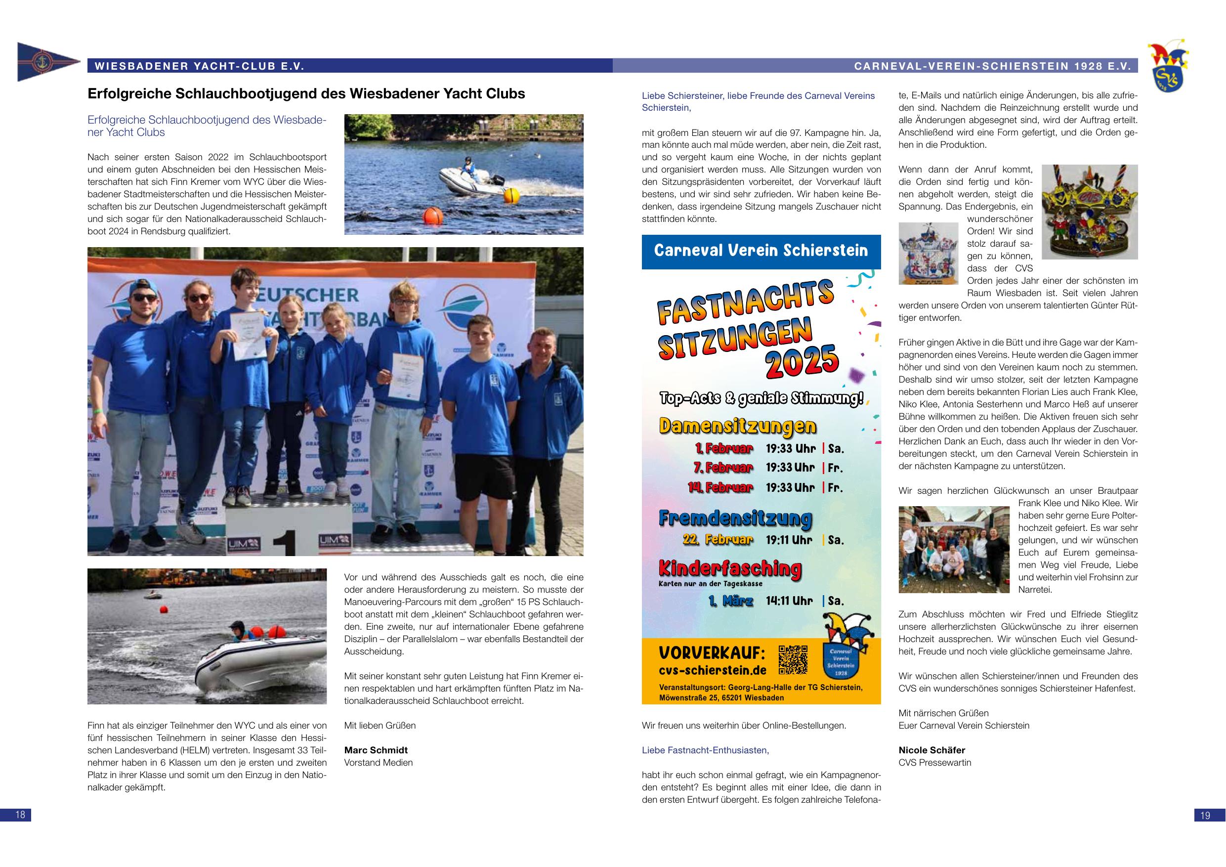 Rückblick auf die Kampagne 2023/24: Die Kampagne war erfolgreich mit stimmungsvoller Aufführung. Prinzenpaar Frank Klee und Niko Klee war auf der Bühne. Höhepunkte: Leistungsschau durch aktive Mitglieder der Garde. Dankeschön an alle Helfer, Gardemitglieder, die Schirmherrn. Vorausschau auf Fastnachts-Sitzungen 2025 (Termin noch nicht bekannt). Ankündigung der Kinderfasching-Sitzung. Nicole Schäfer (CVS Pressewart). Vorverkauf über cvc-schierstein.de.
