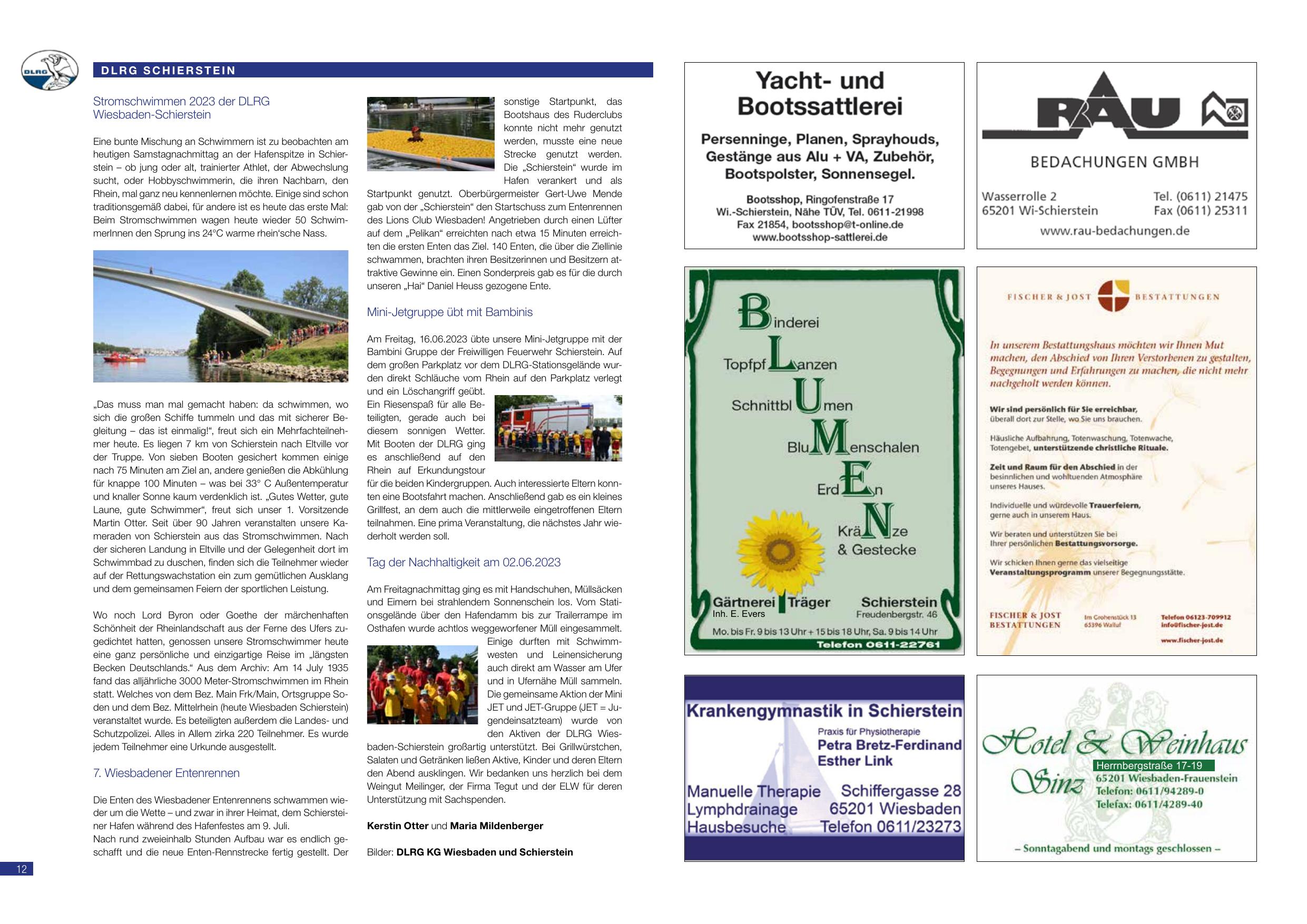 Die DLRG Wiesbaden-Schierstein berichtet über eine erfolgreiche Schwimmsaison. Beim Halbjahresfest an der Hellerbrücke trafen sich viele Mitglieder. Die Truppe von sieben Booten patroullierte beim Strandfest auf dem Rhein. Laut Leni Kimert wurden dabei nach 10 Minuten Rettungseinsatz bei 32°C Außentemperatur und kühler Böe alle Beteiligten gerettet. Auch die Mini-Jetsgate-Gruppe mit den Bambinis (18.06.2023) und die 7. Wiesbadener Elternstreifenregatta wurden erfolgreich durchgeführt. Bericht von Dieter Neuhaus.