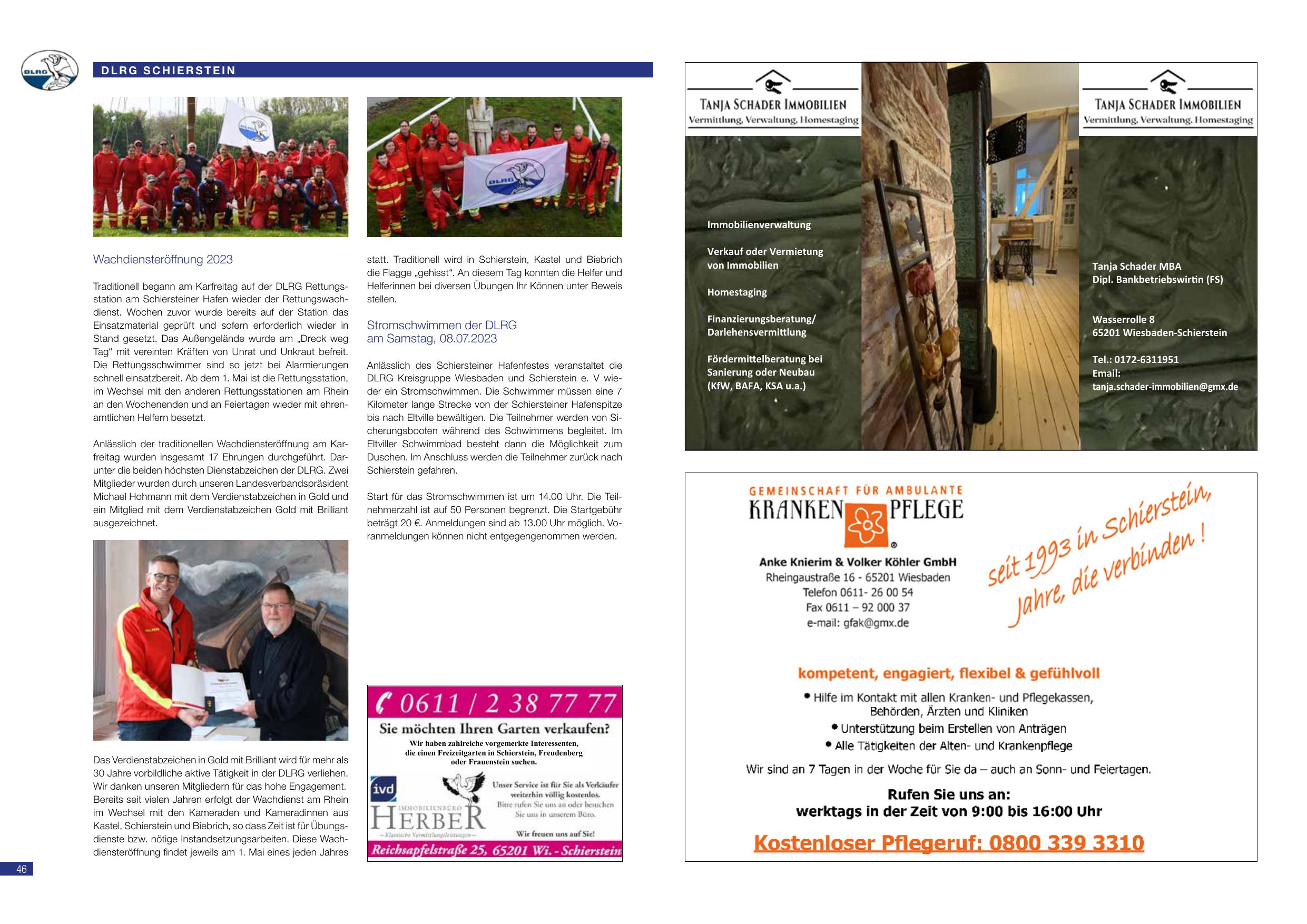 Wachdiensterstattung 2023: Traditionell begannen wir mit der Karbeilag auf der DLRG-Rettungsstation damit, den Wachdienst wieder herzustellen. Die Rettungsschwimmer sind jetzt mit zwei Alarmierungsformen aufgerüstet. Die traditionelle Wachdienstehrung am Karfreitag fand in 17 Ehrungen diesjährig statt, bei der traditionellen Wachdienstehrung wurden im Wechsel mit dem anderen Rettungsgemeinschaften an den Wochenenden von der Schiersteiner DLRG-Gruppe geehrt. Unter ihnen war DLRG-Kreisverbandpräsident Michael Hohmann mit dem Verdienstabzeichen Gold in Brillant ausgezeichnet. Derselbe bot dann vom 1. Mai alle Jahren start. Schirmrennen der DLRG am Sonntag 09.07.2023: Anlässlich des Schiersteiner Hafenfestes veranstaltete die DLRG-Ortsgruppe Wiesbaden das siebente 7 klassische „Stromschwimmen“. Anmeldungen können nicht entgegengenommen werden. Start des Stromschwimmens um 14:00 Uhr.