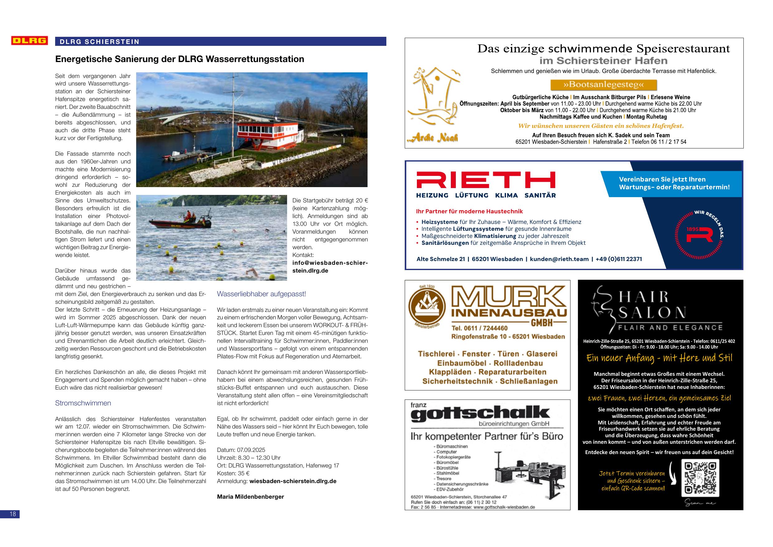 Energetische Sanierung der DLRG Wasserrettungsstation: Seit dem vergangenen Jahr wird die Schiersteiner Wasserrettungsstation der DLRG saniert. Der zweite Bauabschnitt – die Außendämmung – wird derzeit fertiggestellt. Die Fassade stammt noch aus den 1950er-Jahren und wurde mittlerweile modernisiert. Der dritte Bauabschnitt (Photovoltaikanlage auf dem Dach) ist kurzfristig in Auftrag gegeben worden, der die nachhaltige Energieversorgung für die Bootsmotoren sicherstellen soll. Anlässlich des Schiersteiner Hafenfestes veranstaltet die DLRG am 12.07. (Samstag) Stromschnellen, damit die Schwimmer das gewünschte Wasser in der Bismarcksauce gut genießen können. Beim Stromschleifen beginnt um 14:00 Uhr und es können bis zu 50 Personen gleichzeitig teilnehmen. Die Startgebühr beträgt 20 € inkl. Zuschauer. Maria Mildenberger.