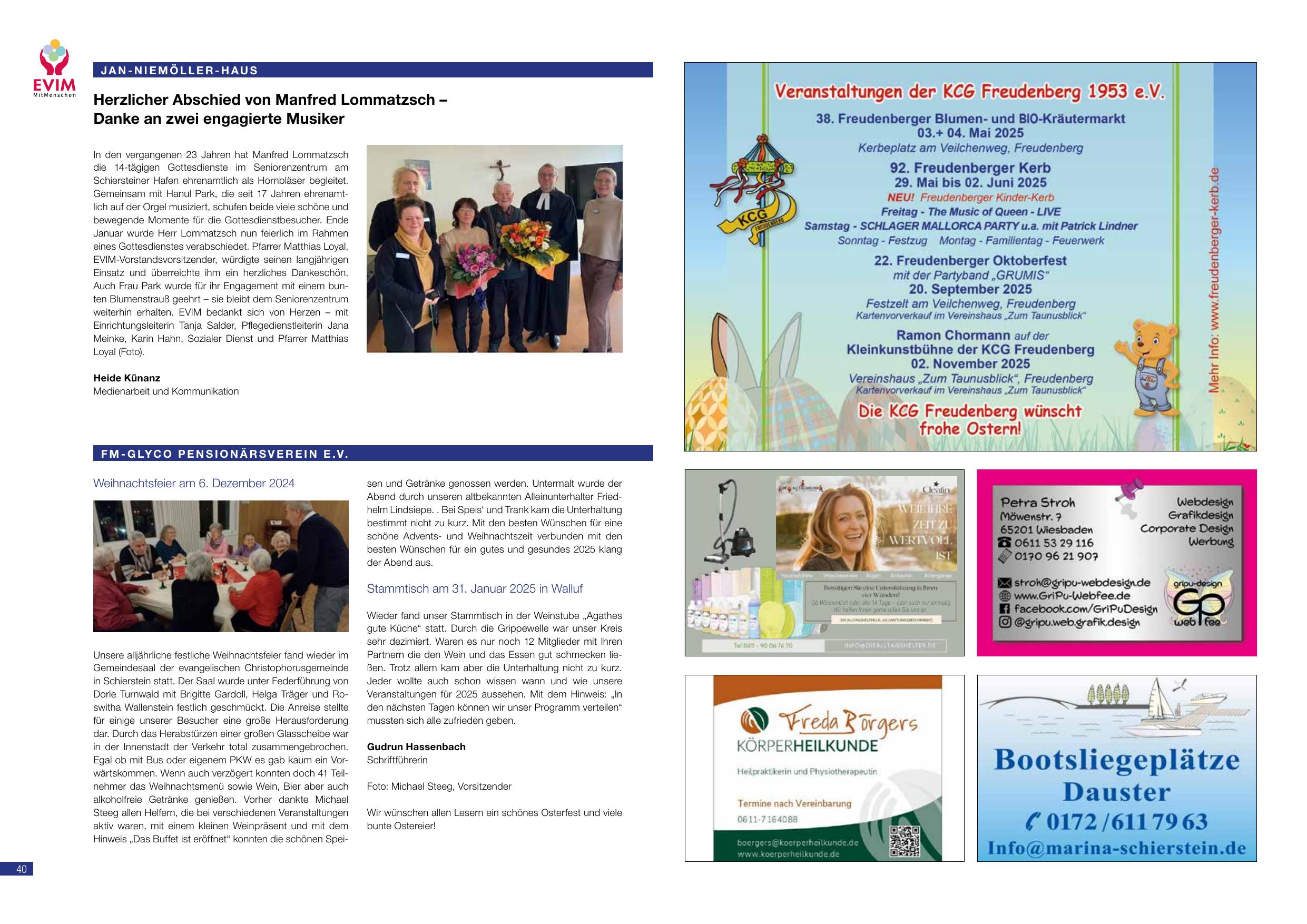 Weihnachtsfeier am 6. Dezember 2024: Die alljährliche Weihnachtsfeier fand wieder im Gemeindesaal der Ev. Christophorusgemeinde statt. Viele Mitglieder und Freunde kamen zusammen, um gemeinsam die Adventszeit zu feiern. Herr Joe Macur begeisterte die Anwesenden mit weihnachtlichen Gedichten und Liedern. Die gesellige Runde genoss Kaffee und Kuchen bei weihnachtlicher Stimmung. Auch der regelmäßige Stammtisch in der Weinreihe findet weiterhin statt. Das Programm für 2025 ist in Planung. Gudrun Hassenbach.