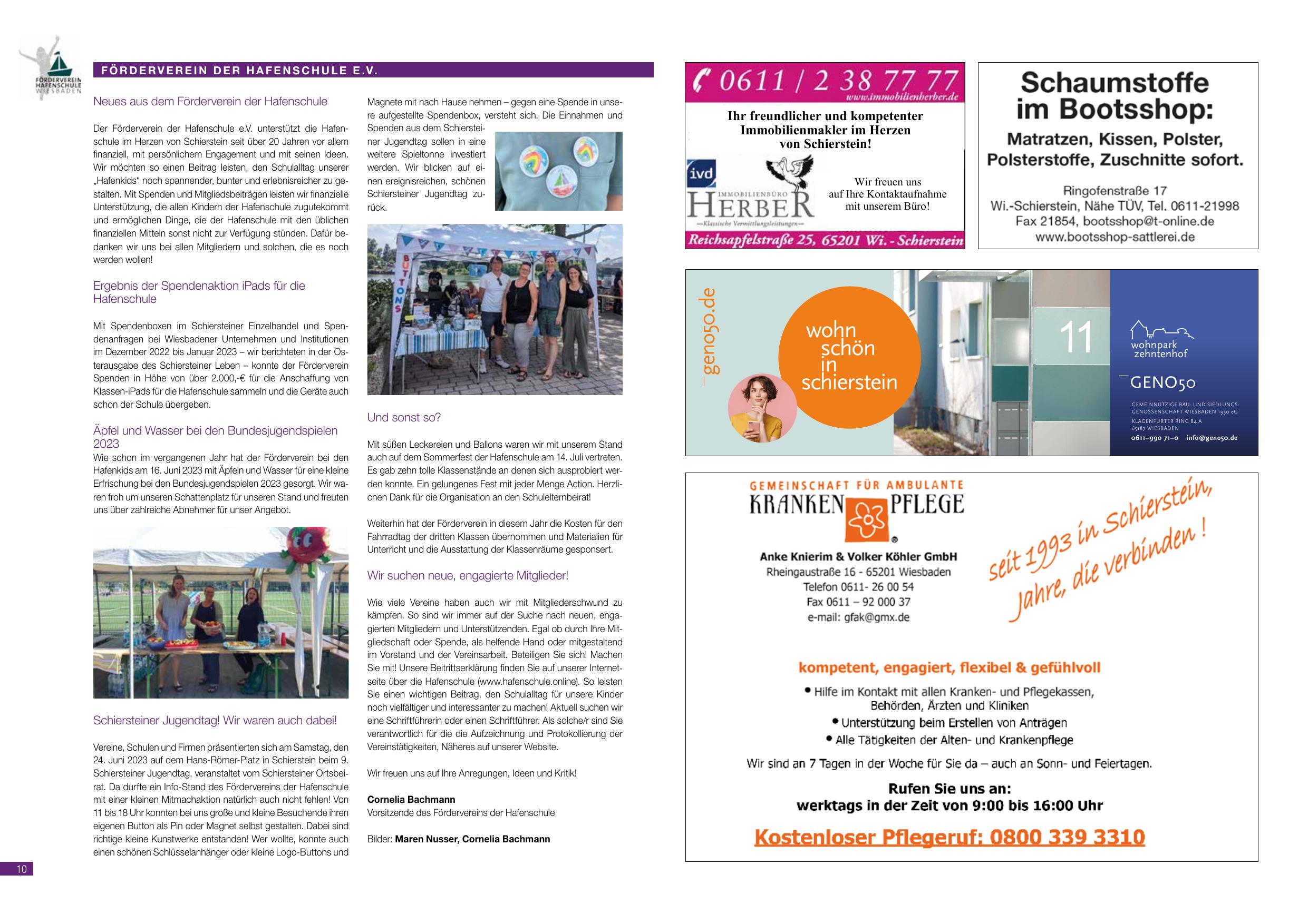 Der Förderverein der Hafenschule e.V. unterstützt die Halbtagsschule im Herzen von Schierstein. In den vergangenen 20 Jahren hat der Verein vieles finanziert, mit pädagogischen Mitarbeiterinnen und Institutionen das Ersatzteil ermöglicht und die Schule zu einer „Halbinsel“ spannender, bunter und erlebnisreicher Schule in Wiesbaden gemacht. Ergebnis der Spendenaktion „iPads für die Hafenschule“: Die Schülerinnen und Schüler der 5. Grundschulklasse konnten hiermit und dem Gerät des iPad sowie den Bundesjugendspielen 2023 profitieren. Aktive Schiersteiner Jugend war ebenfalls dabei bei einer Veranstaltung am Samstag, den 26. August 2023. Neue Mitglieder gesucht! Bericht von Cornelia Bachmann.