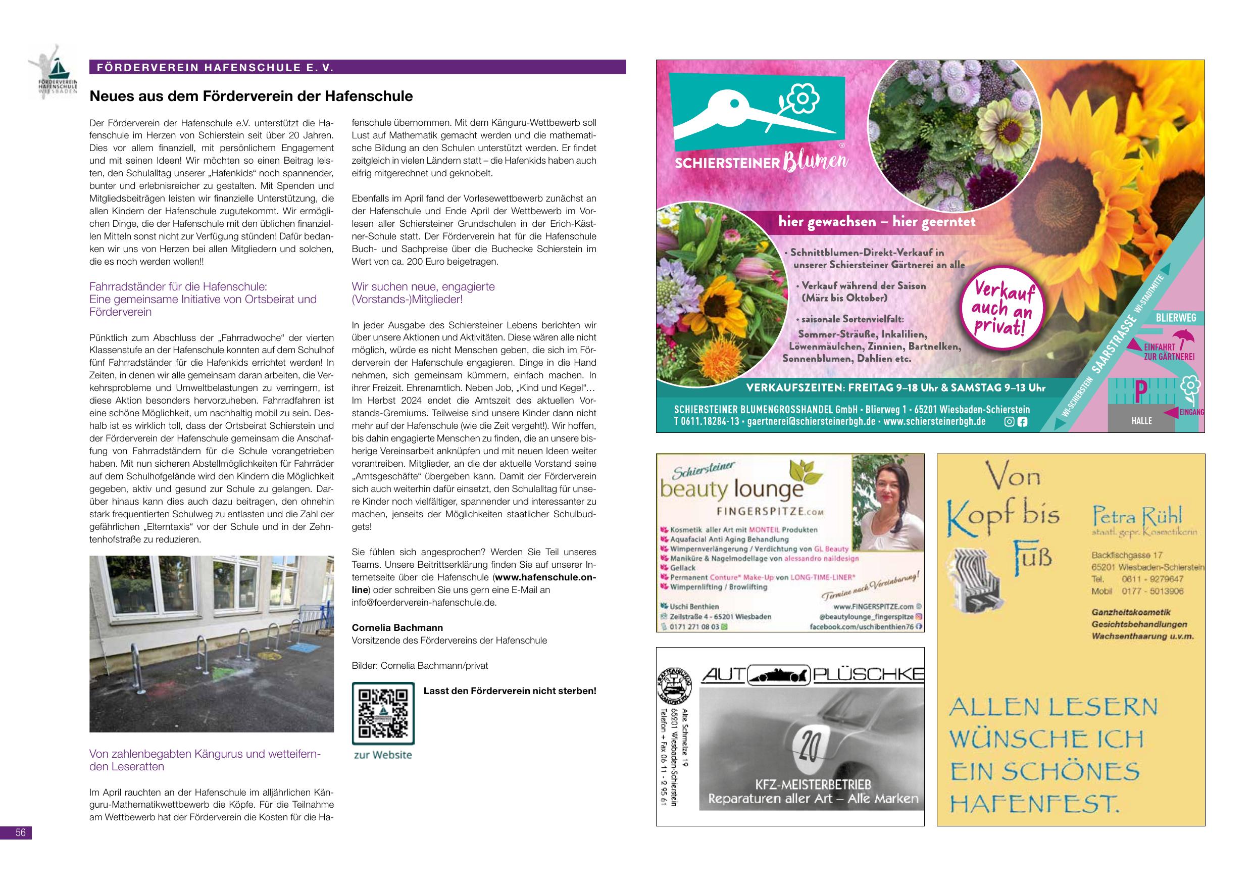Neues aus dem Förderverein der Hafenschule: Der Förderverein unterstützt die Hafenschule finanziell und ideell seit über 20 Jahren. Fahrradständer für die Hafenschule: Eine gemeinsame Initiative des Fördervereins zum Aufbau einer sicheren Fahrradabstellanlage. Fahrradständer wurden am 24.04.2024 fertig aufgestellt. Känguru-Wettbewerb: Im April Abschluss des viertelfinalen Känguru-Mathematikwettbewerbs der Klassen 1–4. Viele schöne Ergebnisse. In Herbst 2024: Amtsübergabe des aktuellen Vorstands. Im April: Känguru-Mathe-Wettbewerb (Köpfe der Teilnehmer: 7. Klassen, Teilnahmezahl 200 Euro Förderung). Cornelia Bachmann (Vorsitzende des Fördervereins der Hafenschule). www.hafenschule.de.