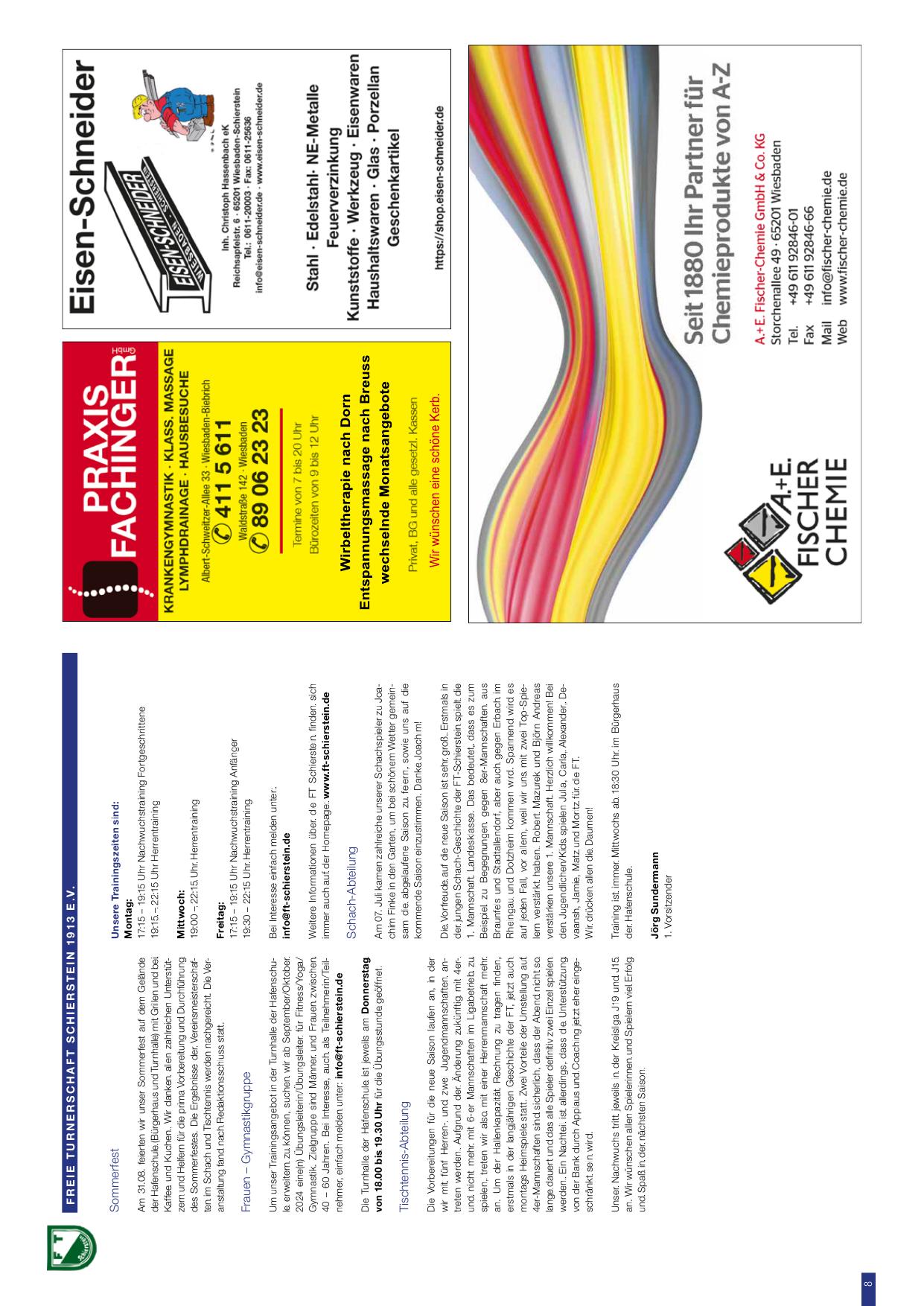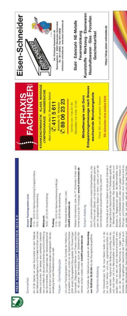 Sommerfest der Freien Turnerschaft Schierstein 1913 e.V.: Am 27.08. feierten wir unser Sommerfest auf dem Gelände der Grundschule/Bürgerhaus und konnten bei Sommer, Sonne, Grillen und Ballspielen viele Mitglieder und Freunde zusammenbringen. Unsere Trainingszeitenzeiten sind: Montag: 14:15–15:15 Uhr Nachwuchstraining und 17:30–21:30 Uhr Herrentrianing Training. Mittwoch: 14:15–15:15 Uhr Nachwuchstraining und 17:00–19:00 Uhr Herrentraining. Freitag: 17:30–18:30 Uhr für Nachwuchs-training. Frauen-Gymgruppe: 18:30–19:30 Uhr. Die Tischtennis-Abteilung trainiert donnerstags von 18:00 bis 19:30 Uhr. In unserer neuen Saison starten wir: Die Vorbereitung für die neue Saison begann mit der 1. Mannschaft in Kooperation zuletzt bei der Durchführung der WBS zu beschleunigen. Unsere Nachwuchs-Schüler erhalten jetzt zwei Trainer. Die Leistungsklasse haben zuletzt bei Spielen und Coaching jetzt die Übungsleitungsarbeit vorbereitet. Unser Nachwuchs tritt beweils in der Kreisliga-J2 in der Kreisliga 2 an und trägt sich mit Erfolg im Spiel und Starten in der nächsten Saison. Jörg Sundermann, 1. Vorsitzender.