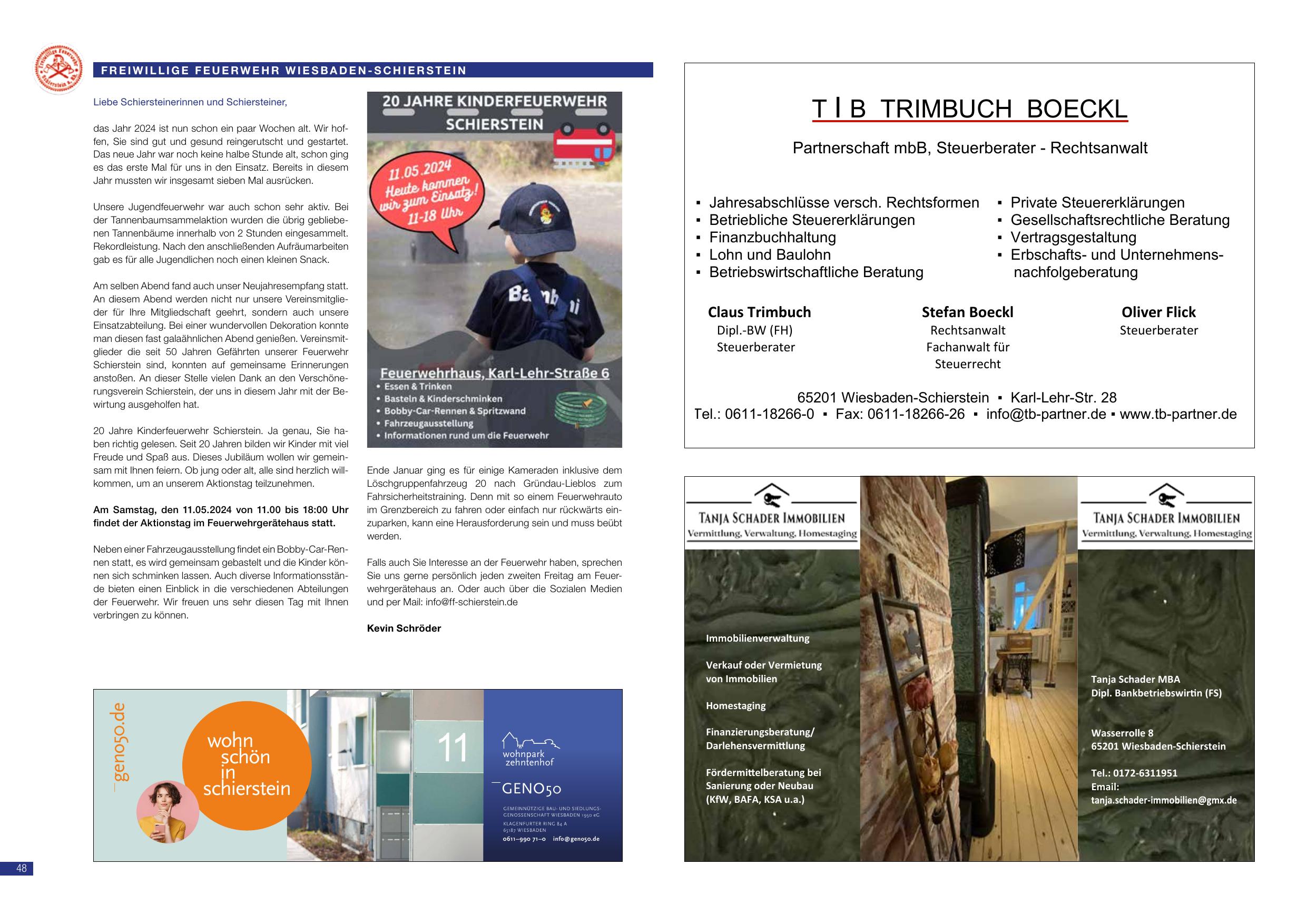 Das Jahr 2024 ist schon ein paar Wochen alt. Wir fühlen uns gut und gesund und gestartet. Die 20-jährige Jugendfeuerwehr Schierstein feiert ihr Jubiläum dieses Jahr. Unsere Jugendfeuerwehr-Mitglieder sind in diesem Jahr sehr aktiv, gerade wegen der Teilnahme an Turnierbewerben innerhalb von 20 Stunden jeweils intensivem Training. Rückmeldung: Nach den verschiedenen Ausfahrtelehrmäßigkeiten haben wir gut Aufmerksamkeit bekommen. Das ganze Jubiläumsveranstaltungspaket wurde dieses Jahr für Schierstein eingerichtet und gemeinsame Erinnerungen angedacht. Am Samstag, den 11. Mai 2024 von 10:00 bis 18:00 Uhr finden Sie unser „Tag der offenen Tür“ in der Feuerwache, Karl-Lehr-Straße 6. Neben einer Fahrzeugsausstellung findet Bobby-Car-Rennen statt. Am 20. Görötz-Labbio zum Feuerwehrhaus gehören. Für alle Fragen zu Ihrer Betätigung sprechen Sie mit uns über Social Media: Schierstein Freiwillige Feuerwehr-Schierstein und auf Mal: info@ff-schierstein.de. – Kevin Schröder.