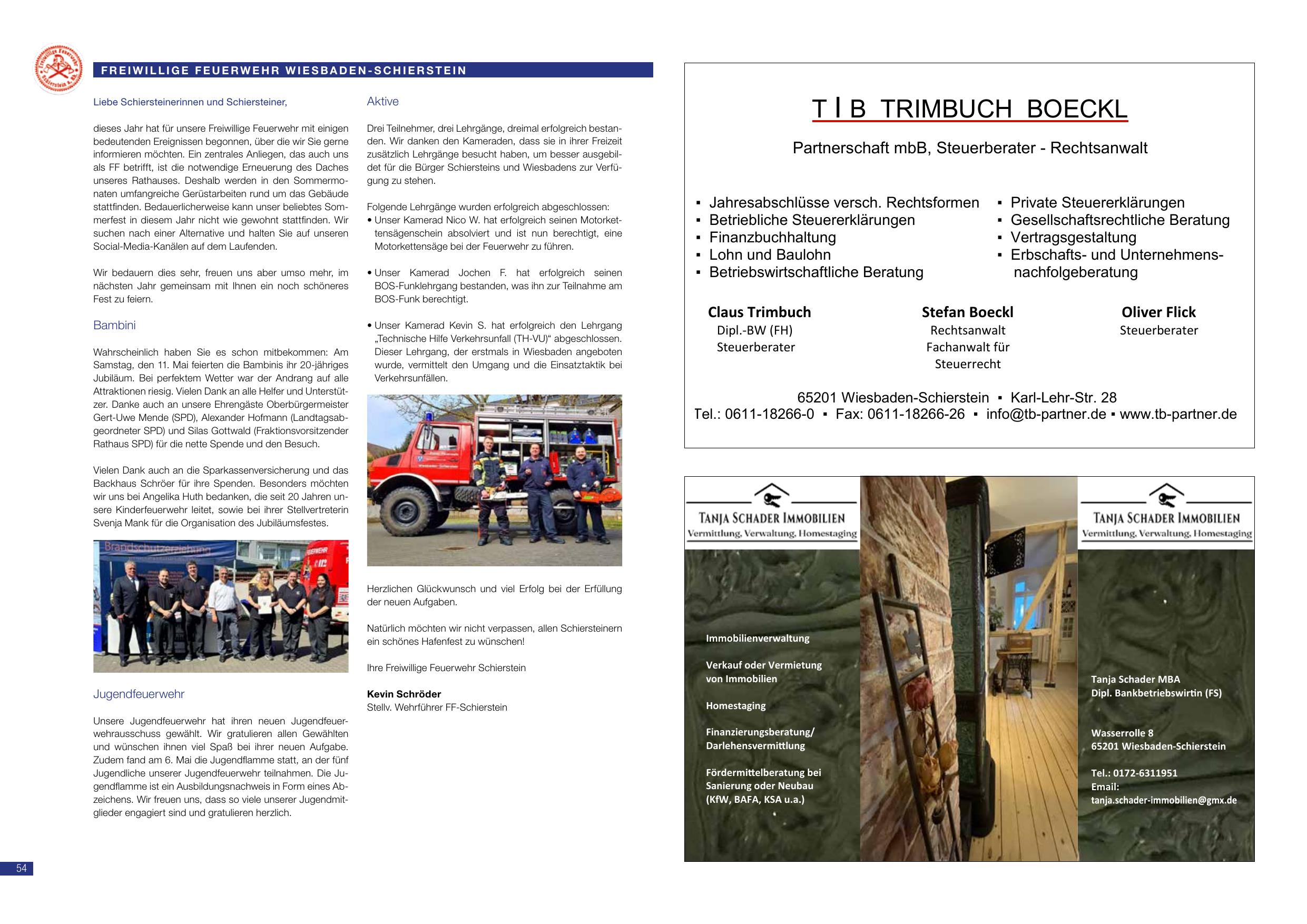 Freiwillige Feuerwehr Wiesbaden-Schierstein: Die Freiwillige Feuerwehr war in diesem Jahr mit vielen Events beschäftigt. Samstag 11. Mai: Bambini-Fest am Bambiniplatz mit 20-jährigem Jubiläum – alle halfen mit. Dank an Angelika Hofmann-Landgrabtschein (SPD), Alexander Hofmann (Landgräfschein), Sibylle Merk sowie Stephan Maria für Organisation des Kinderfestes. Jugendwehr: Neue Jugendwehrwachschussgaben gegeben; Lehrgang Jochen H. absolvierte Abschluss der Technischen TH VUT. Lehrgang Kamerad Kevin S. hat erfolgreich Zugang zu Atemschutzgeräten und Einführung in die BOG-Funk-beendet. Kevin Schröder (Stabs-Wehrführer Schierstein).