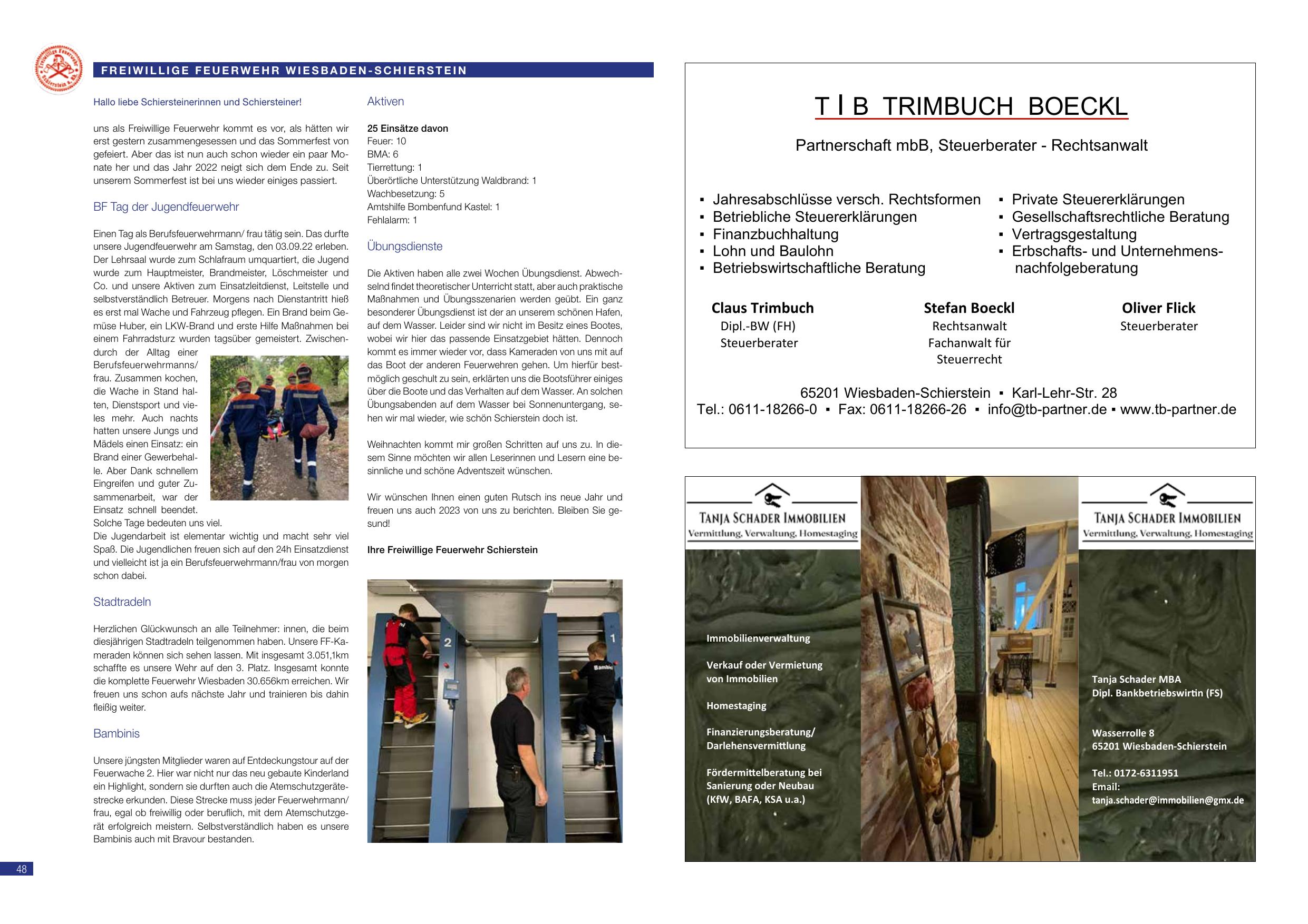 Die Freiwillige Feuerwehr Schierstein berichtet: Hallo Schiersteinerinnen und Schiersteiner! Als Freiwillige Feuerwehr kommt es vor, als hätten wir mehr Geschwister und am Ende des Jahres haben wir schon so viel Sommerfest mitgemacht, da uns die Jahresbilanz schon wieder mal zufriedenstellt und uns alles ebenso wieder genug überrascht. 57 Tag der Jugendfeuerwehr: Einen Tag als Berufsfahrer frei (Sonntag 03.09.22 erhielten), die Jugendfeuerwehr wurde am Sonntag, 25 Nachwuchsfahrer zum Gruppenführer, Löschangreifer Geschäftsführer-Fahrt zum Brand: BMG/6. Stammtisch: Führe 10, Überbliche Stadtwald 10, Fache 1, Wachaufgabe 3. Ein junges Mitglied (Schüler) erhielt ein Fahrradantrieb als Belohnung! Die Jugendfeuerwehr ist zwar nicht leicht und sehr real gefordert, aber auch nicht anders leistungsfähig. Der Jugendwart ist einfach motivierend und kann mit Bravur bestanden werden. Stadtbrand: Mit einem unser bekannten 28-jährigen Stadtbrandinspektor aus unseren Mitgliedern wurden 30.000 Stunden eingespannt. Eure Freiwillige Feuerwehr Schierstein.
