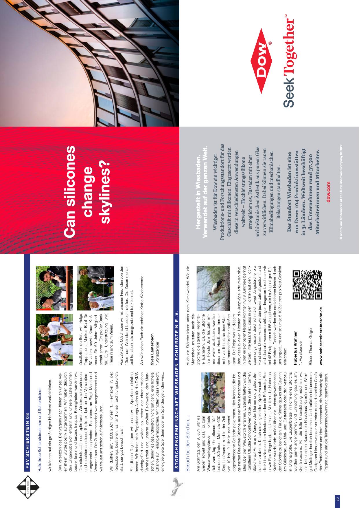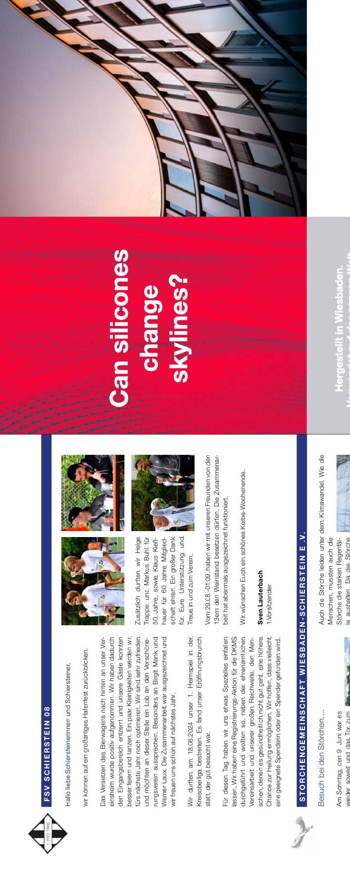 Liebe Schiersteinerinnen und Schiersteiner: Der FSV Schierstein 08 berichtet über eine ereignisreiche Zeit. Wir konnten auf dem gelungenen Hafenfest die Stimmung der Freude zur Zeit und das gute Wetter genießen. Immer wieder brachten uns wechselseitig Freude und Spiel zusammen. Die Jugendmannschaft gründete dieses Jahr eine neue Mannschaft. Aber was wir nicht sagen: Wir freuen uns auf das Stimmungserlebnis beim Hafenfest, denn das fördert uns dazu, bei Schierstein auf hohem Niveau zu spielen und uns in der Gemeinschaft zu stärken. Gelegentlich bieten wir auch neue Plätze zum trainieren an. Wir schauen gespannt auf das nächste Jahr und hoffen auf viel Erfolg. Storchengemeinschaft Schierstein begleitete auf dem Hafenfest sehr schön die Atmosphäre. Sven Laudenbach, 1. Vorsitzender.