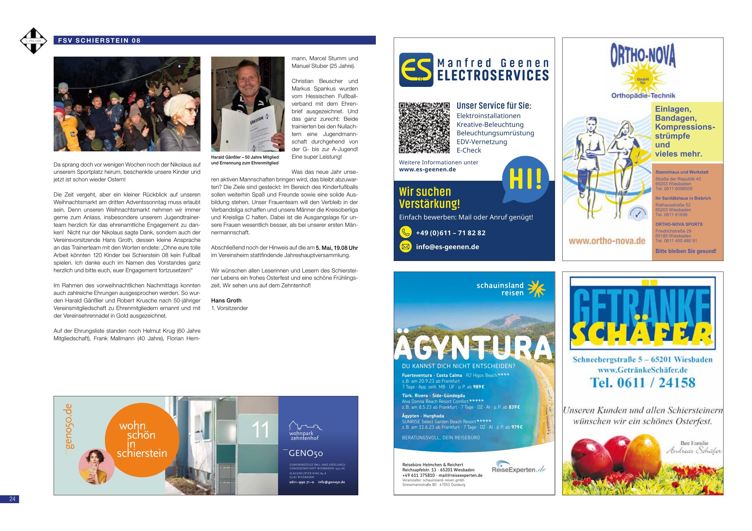 Der FSV Schierstein 08 berichtet: Kurz vor wenigen Wochen noch der Nikolaus auf unserem Sportplatz hereingeschaut und seine Kinder und die Zeit vergrößert sich sehen wieder Lächeln. Bei unserem Weihnachtsmarkt haben wir immer wieder die Vereinsmitglieder für ihr langjähriges Engagement herzlich zu danken – vor allem danken wir Vorstandsvorsitzender Hans Groth, der auf der Vorstands-Ebene viele Anträge mit den Osterferien bearbeitete. Im Rahmen des vorweihnachtlichen Nachtessens konnten auch zahlreiche Ehrungen vorgenommen werden. So konnten für den Harald Gärtner und den 50-jährigen Kick-Anzeige 50 Jahre Vereinsmitgliedschaft zu Ehrenmitglieder ernannt und mit dem Vereinsmaterial in Gold ausgezeichnet werden. Für die Ehrungsliste stehen auch die aktuellen Jubilare: 50 Jahre Vereinsmitgliedschaft: Hans Groth (50 Jahre). Franz Mühlmann (60 Jahre). Florian Hermann. Hans Groth, 1. Vorsitzender.