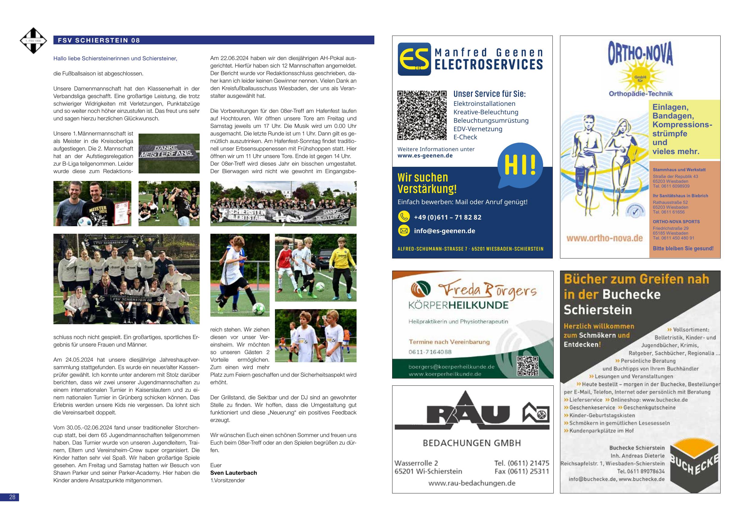 Der FSV Schierstein 08 hat die Klasserhalt im Fußball-Kreisliga erfolgreich abgesichert. 1 Meisterschaft in der Kreisklasse: Aufstieg in die Kreisliga. Besondere Erfolge: Teilnahme bei der Jahreshauptversammlung durch 30 Mitglieder. Am 22.05.2024: Aufstieg in die Kreisliga gefeiert. Am 24.05.2024: Schlussbericht durch Vorstand Lothar. Zukunftsplan: weitere Nachwuchskräfte fördern, neuen Trainingsstudio in Kooperation mit dem WVS einrichten. Am 28.05.2024: Großes sportliches Abschlussereignis. Vorstand: Sven Lauterbach.