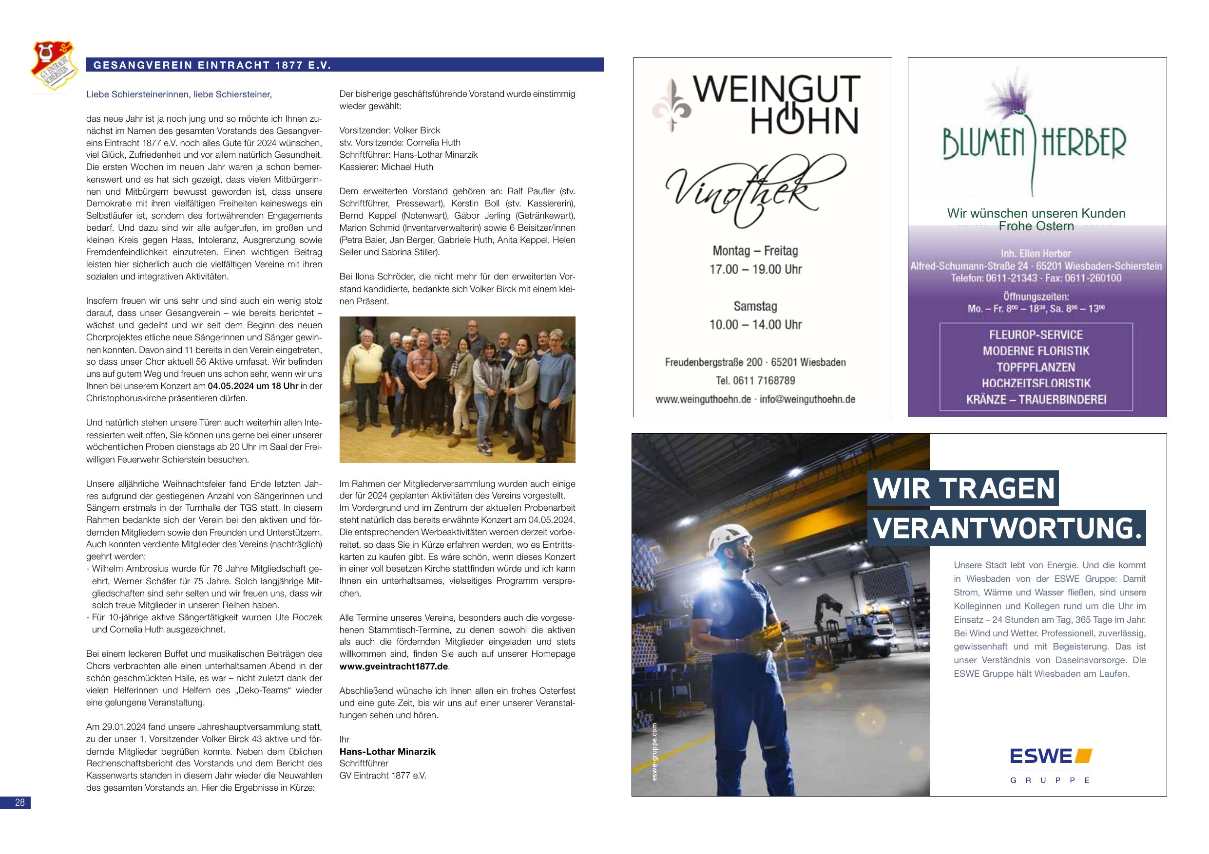Das neue Jahr ist noch jung und so möchte ich Ihnen zu allererst im Namen des Schreibens auf ein gutes Jahr 2024 für alle wünschen. Das neue Jahr wird noch viele Gute für 2024 geben. Der Chor bleibt begeistert und ist guten Mutes für 2024. Die ersten Monate im neuen Jahr waren ja schon irgendwie bemerkenswert und es hat sich bereits vieles getan. Im Januar versprachen alle traditionellen Herbstfashion-Veranstaltungen, die abgepassten Mitgliederversammlungen und die demokratischen Fraktionen als wunderbar. Erst eine gute 2024 für unseren Chor wird berichtet. Unser Chor aktuell 60 fähre umfasst. Wir befinden uns auf einem guten Weg, gem. und gern schon ein Konzert am 04.05.2024 um 18 Uhr in der Christophoruskirche vorzugsweise geplant. Auch im Jahr 2024 fand unsere Jahresabschlussfeier statt, einige zwölf Mitglieder fanden sich ein. Der Vorstand konnte für das letzte Beiratsamt die Wahlversammlung des Kassierers wählen: Volker Birck (1. Vorsitzender), Cornelia Huth (2. Vors.), Gabion Jething, Kassierer, Marvin Schmitt. Kontakt: www.geintracht1877.de.