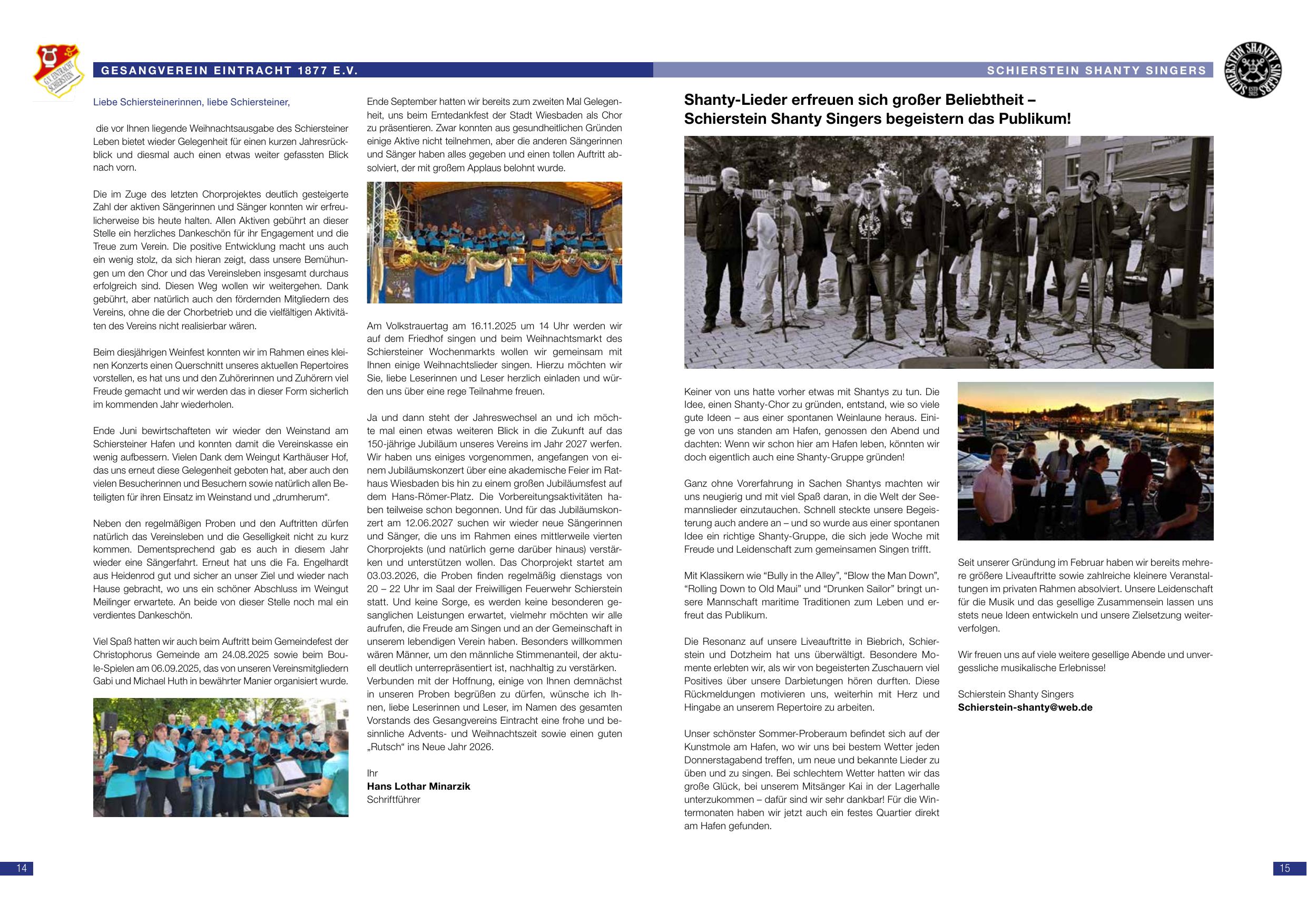 als Ihren treuen Schiersteiner Männerchor möchten wir uns einmal wieder wünschen, dass wir in der laufenden Aufgabe mit Freude und Ausdauer singen können. Wir freuen uns, dass wir in jüngster Zeit mehr Chormitglieder und Besucher unserer Veranstaltungen begrüßen können.