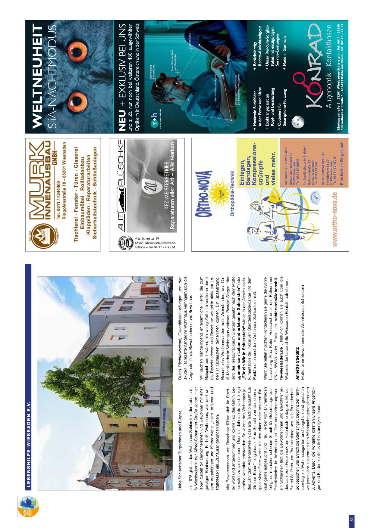 Liebe Schiersteiner Bürgerinnen und Bürger: Die Lebenshilfe Wiesbaden e.V. ist seit 1976 Teil der Nachbarschaft der Lebenshilfe Schierstein in Wiesbaden-Schierstein. Als Bewohner, Bewohnerinnen und Mitarbeiterinnen gestalten wir seit 45 Jahren das Leben in der schönen Schiersteiner Straße am Rhein. Durch Pflichtenverteilung, Geschäftsführer, und dem direkten Netzwerk eröffnen sich eine Vielzahl an Möglichkeiten. Wohnhaus Schierstein liegt an der Alma-Schiersteiner-Straße. Durch Pflichtenverteilung, Anmeldung bei Eike Nörzel können auch Kinder und Jugendliche hier tolle Nachmittage verbringen. Das Wohnhaus beherbergt verschiedene Wohngruppen für Menschen mit geistiger Behinderung, Begleitung durch die Gemeinschaft und Unterstützung im Alltag sind das Herzstück der Arbeit. Die Geschäftsführung betont, dass die Schiersteiner Lebenshilfe stets um das Wohlbefinden ihrer Bewohner bemüht ist. Annette Stieglitz. Kontakt: wohnhaus-schierstein@lebenshilfe-wi.de oder Mail an wohnhaus-schierstein@lebenshilfe-wiesbaden.de. Telefon (0611) 18685-31.
