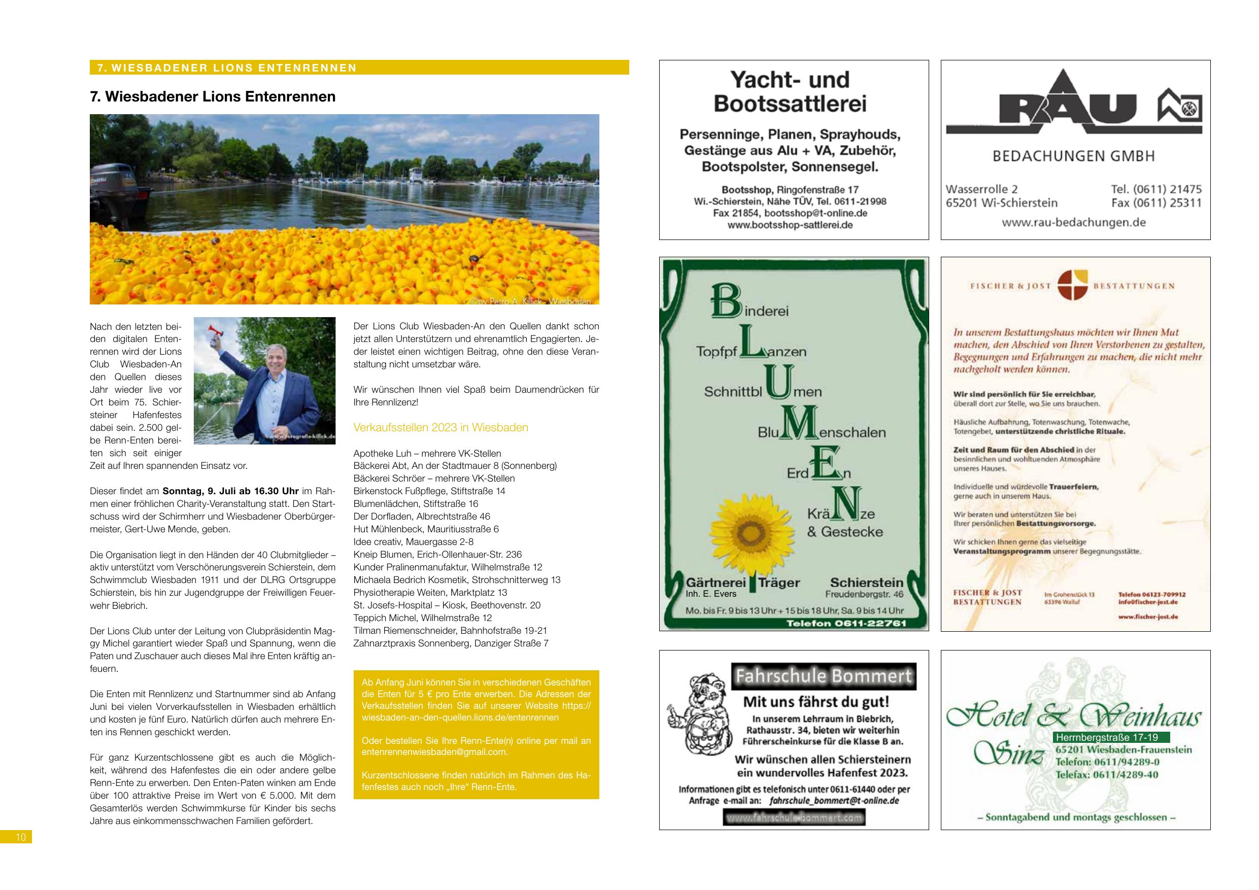 7. Wiesbadener Lions Entenrennen: Nach den letzten drei digitalen Entenrennen konnte das 7. Wiesbadener Lions Entenrennen wieder live stattfinden. Den Quellen dieses Jahr wieder treu, fiel es zum 75. Schiersteiner Hafenfest. Am Samstag, 9. Juli ab 16:30 Uhr im Rhein fand das Rennen statt, mit dem Startschuss durch Gert-Uwe Mende, Oberbürgermeister Wiesbaden. Die Organisation lag in den Händen der 40 Clubmitglieder. Für Kanal-Schlossigkeit als Möglichkeit gab es 5 Euro pro Ente, maximal 5 Tiere. Gesamterlös geht an einkommensschwache Familien in Wiesbaden. Der Lions Club unter Leitung von Clubpräsident Mag. Go Mick gebariert wieder Spaß und Spannung, wenn Enten und die fleißigen Hände im Hintergrund lassen viele schöne Dinge entstehen.