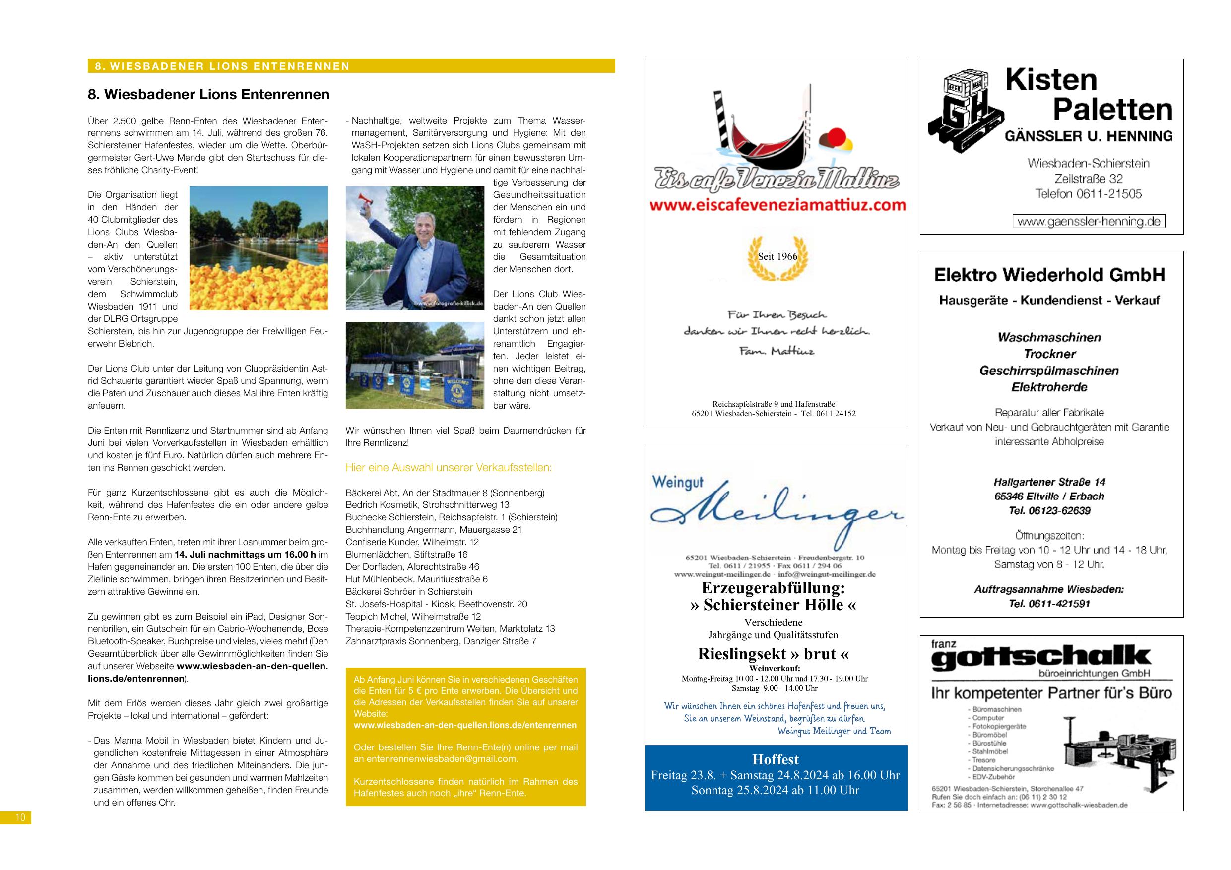 Bericht über das 8. Wiesbadener Lions Entenrennen am Schiersteiner Hafenfest. Über 2.000 gelbe Renn-Enten des Wiesbadener Lions-Clubs nehmen teil. Schirmherr: Oberbürgermeister Gert-Uwe Mende. Startgeld: je 5 Euro, Nachkauf möglich. Erlös geht an den Lions Club Wiesbaden. Charity-Projekt: „Das Manne Möbil“ – ein Sozialkaufhaus für Kinder und Jugendliche in Wiesbaden, das Kindern und Jugendlichen aus einkommensschwachen Verhältnissen Möbel und Wohnungseinrichtung schenkt. Weitere Lions-Projekte: Wasser-Management, Kampf gegen Hunger, Umweltschutz. Benefizveranstaltungen u.a. bei Schäfer & Saveur. www.lions-wiesbaden.de/entenrennen.