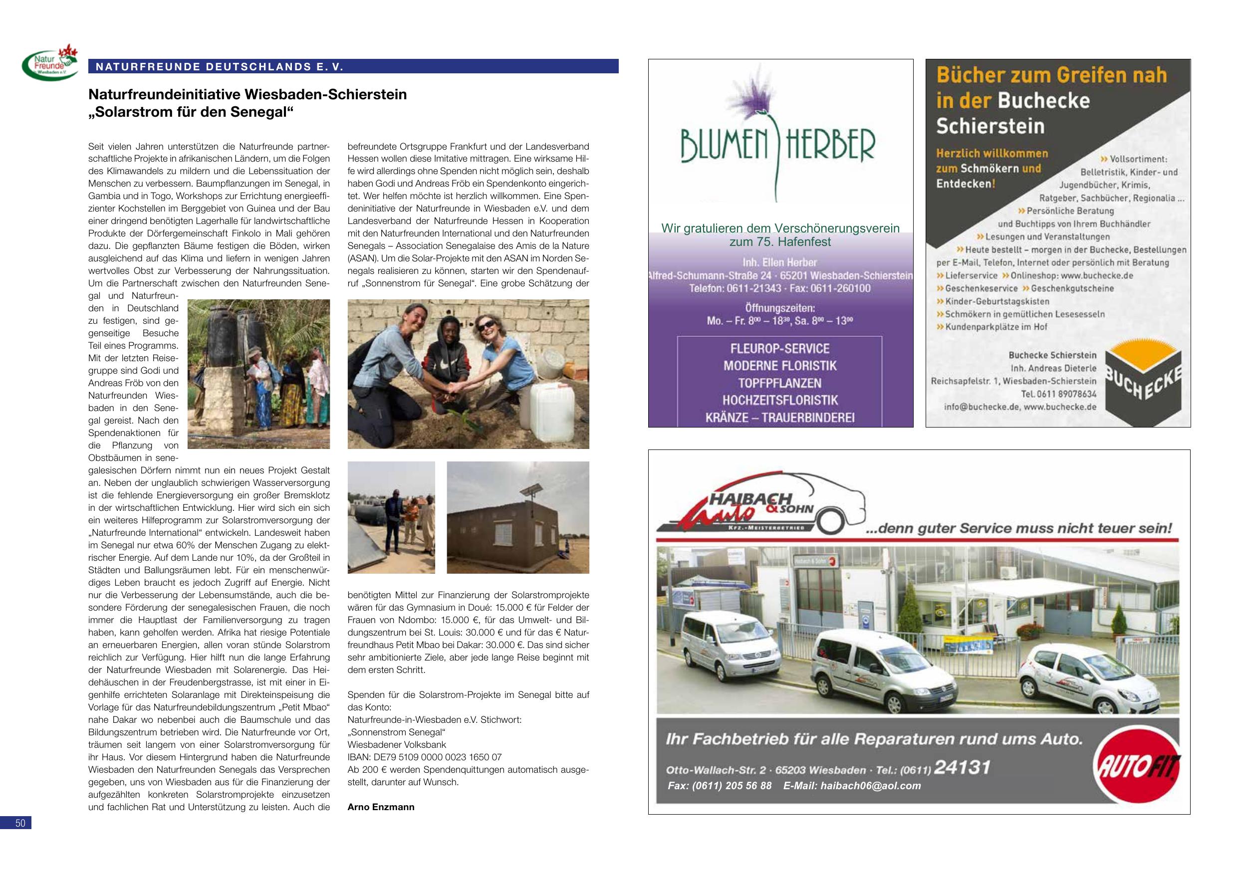 Naturfreundeinitiative Wiesbaden-Schierstein „Solarstrom für den Senegal“: Im letzten Jahr unterstützten die Naturfreunde gemeinschaftliche Projekte in afrikanischen Ländern, um die Folgen des Klimawandels zu mildern und die Lebensumstände der Menschen zu verbessern. Bäumepflanzungen, Straßenbau und der Bau einer Bildungsanlage unter Einsatz der lokalen Bevölkerung — als praktischer Koch-Einsatz in Mauritanien (aus Guinea) und der Bau verschiedener Produkte der Dorfgemeinschaft Pirékox in Mali gehören dazu. Das geplante Projekt von Arno und Andrea Fritz von Ort, dem Naturfreunde-Ort: Der Solaranlage für das Senegal-Bildungszentrum (Petit Mbao). Spenden für die Solaranlage in Senegal unter Stichwort „Solarstrom Senegal“, IBAN DE19 5109 0000 0035 1930 54. Berichterstatter: Arno Enzmann.