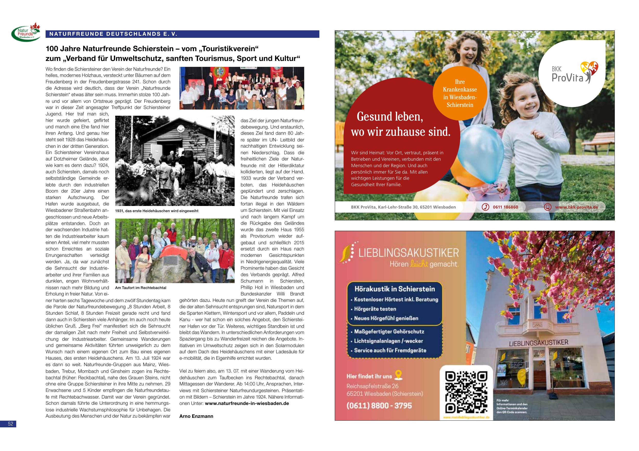 100 Jahre Naturfreunde Schierstein – vom „Touristikverein“ zum „Verband für Umweltschutz, sanften Tourismus, Sport und Kultur“: Gründung 1924 in Schierstein, seitdem über 100 Jahre Vereinsgeschichte. Beginn als Wandergruppe mit Versammlungen im alten Haidhaus. Boom in den 1960/70er Jahren durch Industrialisierung. 1920er Gründungsdekade startete aus einem Schiersteiner Gasthaus. Seit 1920 trafen sich Mitglieder regelmäßig aus Wiesbaden, Mainz und Frankfurt. Am 13. Juli: Wanderung vom Taunus nach Schierstein (4.000 km Anfahrt). Präsentation am 13. Juli mit Naturfreunden. Programm: 13.07. Hafenplatz (9–11 Uhr), 13.07. (22 Uhr Wanderung endet). Arno Erasmus (Bericht).