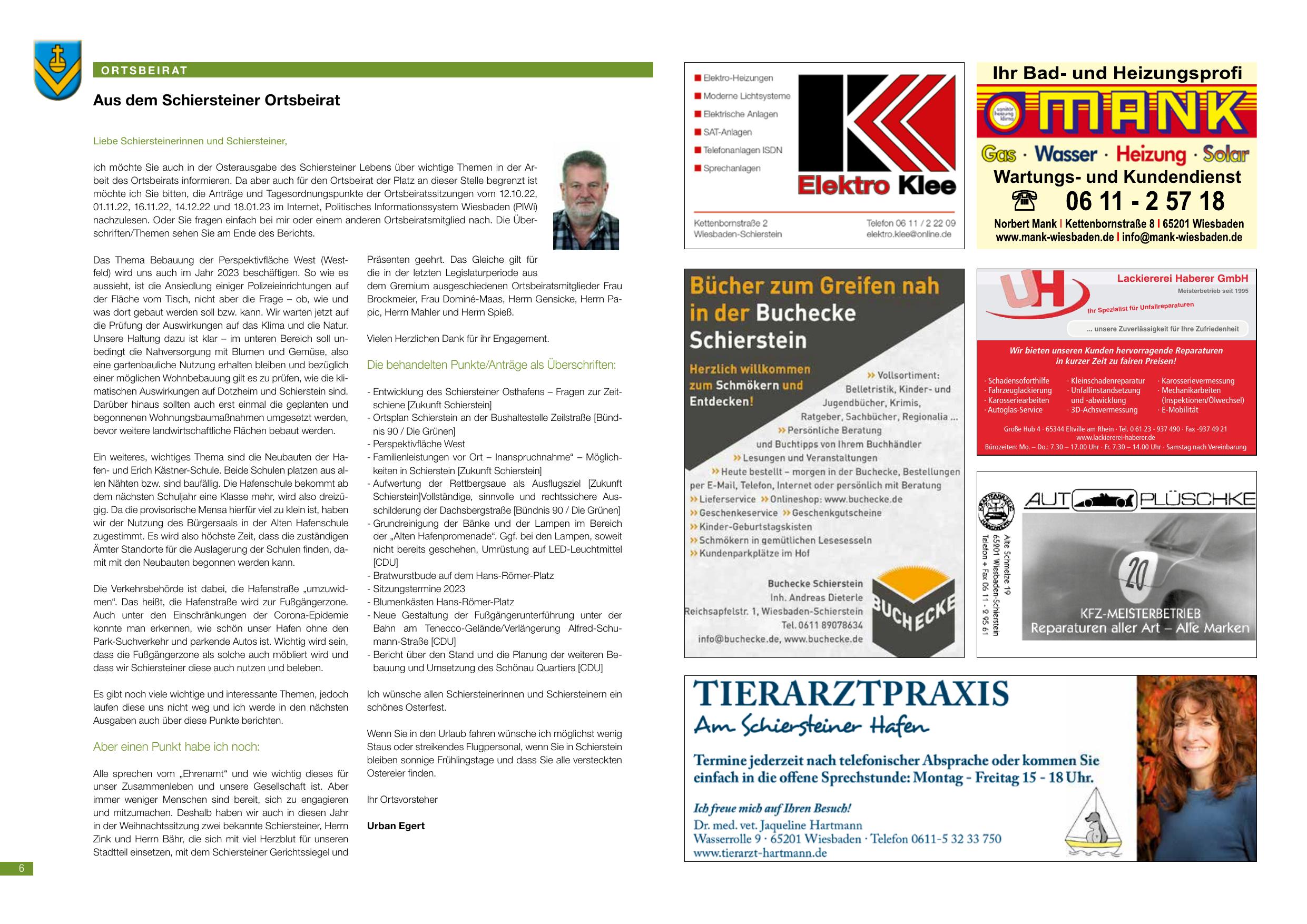 Aus dem Schiersteiner Ortsbeirat: Der Ortsbeiratsvorsitzende Urban Egert berichtet über aktuelle Themen. Ein wichtiges Thema in dieser Ausgabe betrifft den Perspektivwechsel West – Wiesbaden, der im Jahr 2025 beschlossen wurde. Dabei soll die Fläche vom Tuch und Garn-Gebäude genutzt werden. Die Nutzung sollte eigentlich eine gewerbliche sein, aber der Ortsbeirat ist der Meinung, dass eine gastronomische Nutzung als Alternative besser wäre. Die Verkehrsinfrastruktur war ein weiteres Thema: Die Hafenstraße betrifft die Fußgängerzone und wird möglicherweise ein Spielfeld für Fußgänger und Radfahrer. Der Ortsbeirat behandelte außerdem das Thema Corona-Route in der Hafenzone. Präsentiert wurden die Gutachten der Ortsbeiratsmitglieder Rainer Böckmann, Frau Donna-Maja, Herrn Gensanz und Herrn Paulsen. Vielen Dank an alle für ihr Engagement.