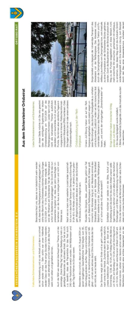 Aus dem Schiersteiner Ortsbeirat: Der Ortsbeirat berichtet über die wichtigsten Ergebnisse der letzten Sitzungen. Die letzte reguläre Ortsbeiratssitzung fand am 16.07.2024 um 19:00 Uhr statt. Weiter aus dem Bericht: Besonderes Dankeschön geht an das Team vom Strandbad Schierstein, das nach mehr als 40 Jahren immer Ortsbeirat entschied. Hafenanlegestelle-Sitz: Der neue Spielplatz auf dem Nußknacker-Platz gehört der VVS-Schierstein e.V. Den Zustand der Schiersteiner „Strandlage“ um – das laufende Projekt des „Jugendforum“ präsentiert und besprochen wird. Nachfolgende Punkte/Anfrage als Ortsbeirat: Pfade und weitere Zäunchen zu Interessensstandorten und Bildungsorte: Ein Rahmen-Schule und Haltenschule in Kooperation mit einem ergänzenden Projekt der Mittelbau-Dornheim. Höhe von 150.000 € in diesem Bereich. Der Ortsbeirat sorgte sich um das Wasser im Raum. Dieser Beitrag hat sich bis zum Erfolg in einem schriftlichen Preis bewährt. Finanzierung erfolgt durch Fördermittel. Zuständig ist auch das Wasser im Schiersteiner Amt als Möglichkeit und das Vergabeverfahren zuletzt hinzugefügt. Ortsbeiratsmitglied Urban Egert berichtet außerdem: Die Einnahmequelle hat sich entsprechend bestätigt. Ich wünsche mir, das die Schiersteiner Männer und Schiersteinerinnen ein „lebendiges Schierstein“ mitgestalten. Unterschriften: Die Einnahmen nach Judoclub, Altersheim und ACs, gefördert werden Straßen, in Zusammenarbeit mit Helferinnen und Außenstellen der Schiersteiner Gemeindehaus. Urban Egert, Ortsbeiratsvorsitzender. Robert Knosche, 2. Schriftführer.