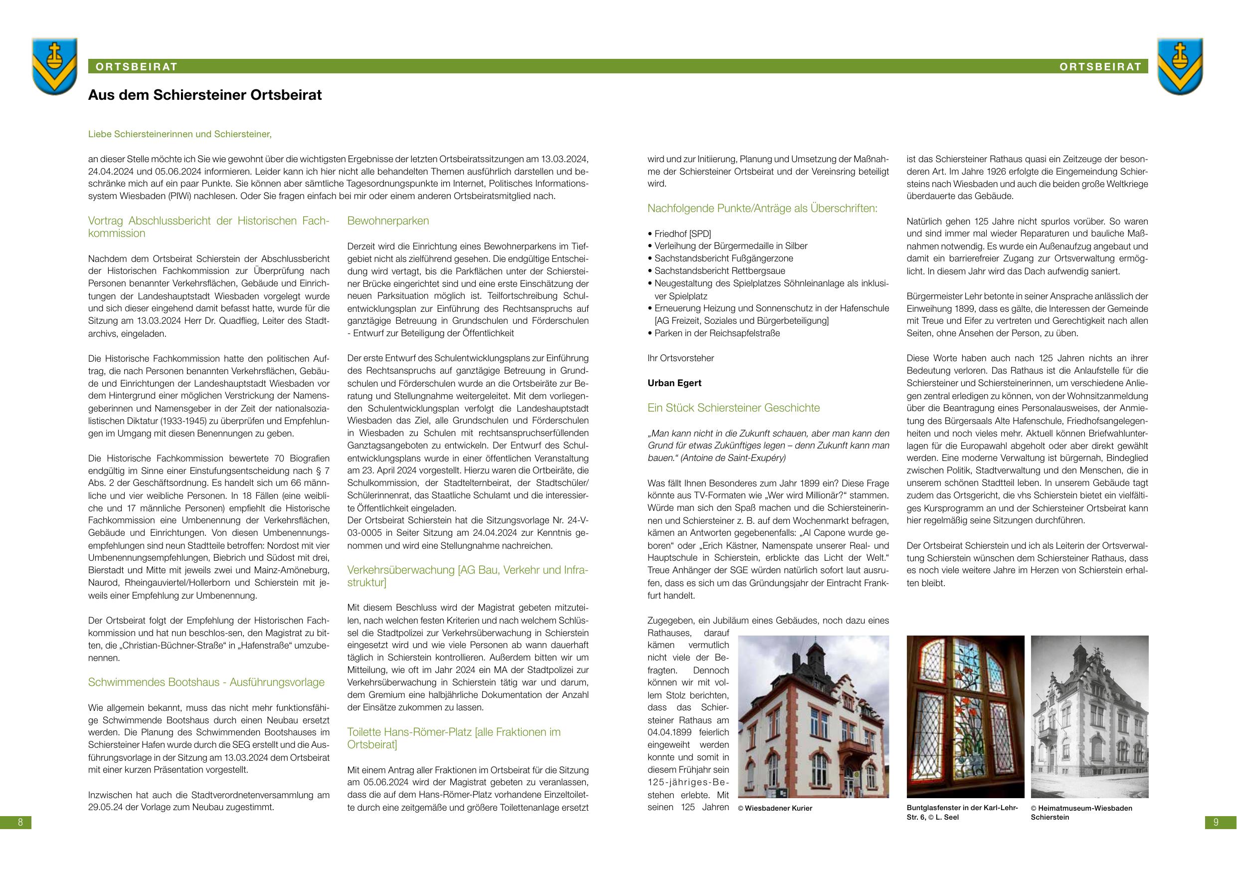 Bericht des Ortsbeirats Schierstein: Vortrag des Abschlussbericht der Historischen Namensfachkommission am 13.03.2024. Termine: 24.04.2024 und 05.06.2024. Themen: Unzulässige Veränderung der Namensgebung und Namensnennungen in Wiesbaden von 1933–1950 sowie Umgang damit. Schwimmboothaus-Ausführungsvorgaben: Planung für Schwimmboothaus an der Schiersteiner Promenade wurde in der Sitzung am 13.03.2024 mit verschiedenen Entwurfsvarianten besprochen. Verkehrsanbindung AG Bau, Verkehr und Infrastruktur: Tagesordnung umfasste Schließung des Hans-Fölzer-Platzes und Einführung von Parkautomaten.