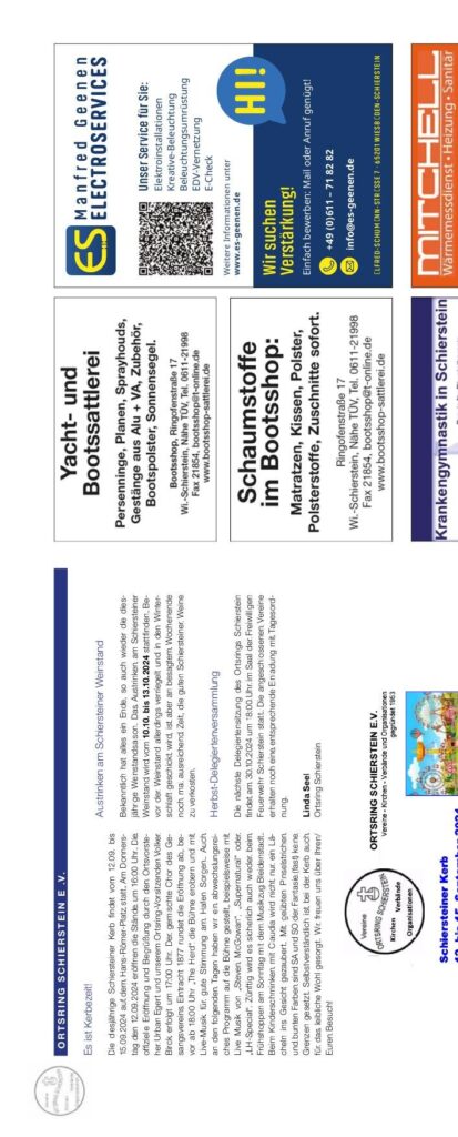 Es ist Herbst! Der Ortsring Schierstein e.V. berichtet: Am 16. August 2024 öffnete auf dem Schiersteiner Weinstand die Bühne von 16:00 bis 18:00 Uhr mit einem Beitrag der Stadtkapelle von Schierstein und Wiesbaden, begleitet von unserer Chorleiterin. Die Stimmung war ausgelassen und festlich. Die Damen brachten zum Teil farbenfrohe Trachtenkleidung mit. Das Weinfest wurde schon am 12. September 2024 gut beendet. Unserer Chor sang dabei mit unserem Musikzug der Fördervereinschor mit dem Herbst-Programm mit einer musikalischen Abendfeier und Stimmungslieder. Ab Oktober, 14 Uhr, singt die Bühne am Wochenmarkt, zum Herbstprogramm der beliebten Kerbeveranstaltung. Termine: Samstag 12.09.2024 und Sonntag 13.09.2024. Schiersteiner Kerb: 12. bis 15. September 2024, Hans-Römer-Platz. Linda Seel, Ortsring Schierstein e.V. Ortsring Schierstein e.V., Wein · Kerbes · Kultur und Veranstaltungen.