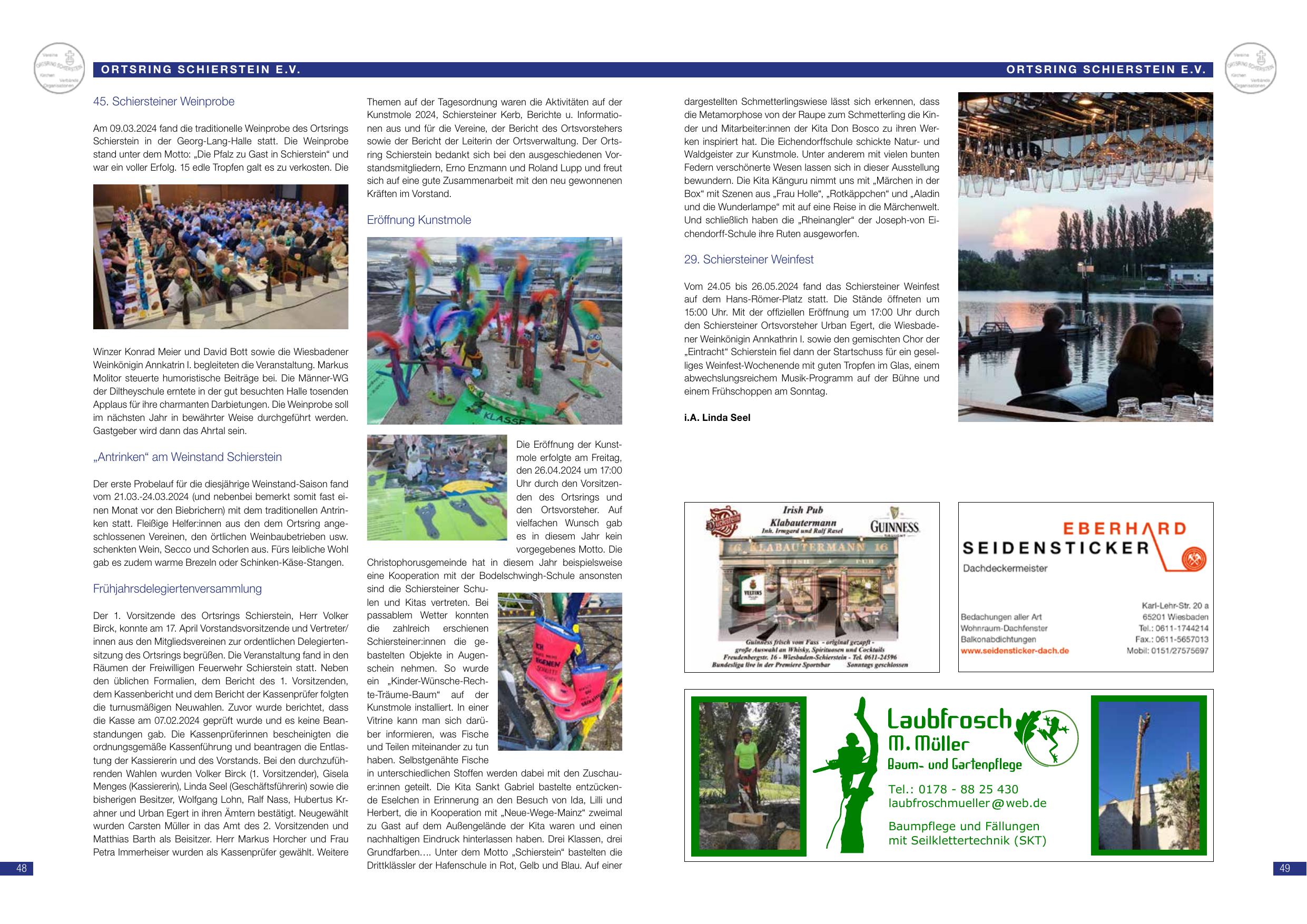 45. Schiersteiner Weinprobe: Am 20.03.2024 fand die traditionelle Weinprobe des Ortsrings Schierstein in der Schule im Sauerland mit dem Motto „Die Pfalz ist zu verlosen. Die 6 Tropfen gut zu verlosen.“ Über 130 Personen nahmen teil. Weinkenner Konrad Miser und David Brill waren die Wiesbadener Weinkenner. Markus Möller beleitete die Veranstaltung. Frühlingsdelegiertenversammlung: Am 11. April Vorstandsberatung und Vertreter mehrerer Schiersteiner Organisationen eröffneten die Kassenprüfung des Ortsrings. Jahreshauptversammlung am 01.04.2024 fand dann statt und Kassenwart Volker Brill, Gerda Wüst (Kassenhüferin), Bernd Barth (Beisitzer), Emily und Julia Brauer sowie Monika Käfer (Gäste) anwesend. Weiteres Weinprobenfest am 26. Mai mit Müllusikstück, Orchester, Gesangschor und Pfalzkultur. L.A. Linda Seel (Bericht).