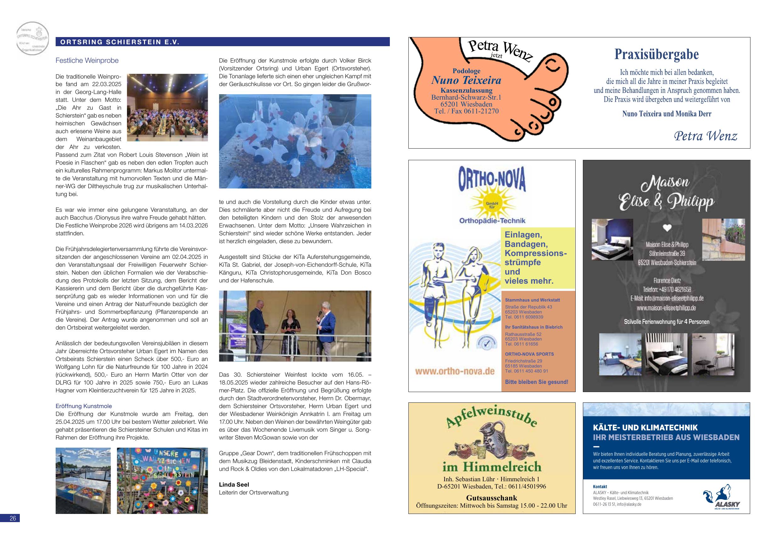 Die traditionelle Wämpole-Feier fand am Samstag, 22.03.2025, statt – diesmal zu Ehren des Stadtbezirks Schierstein. Ein kulturelles Rahmenprogramm mit Robert Louis Stevensons „Reise ins Innere der Erde“ und einer Lesung folgten. Das Frühlingsfest mit Kinderprogramm wurde von der Veranstaltungsgruppe des Ortsrings gut angenommen. Die FEG/CG Pensionsärsvereins e.V. brachten einen Schek über 100 €, einen Euro an Martin Ott für 100 Jahre DLRG, 250 € an Lukas Magner für Kinderbücherein für 125 Jahre in 2025. Der 30. Schiersteiner Weinfest findet am 19./20.2025 in der Rheingaustraße statt; das Weinlesefest wird wieder mit Sänger und Songwriter belebt. Die Öffnung der Kunstmesse fand durch Volker Beck statt. Am 4. Mai traten Kinder der Schiersteiner Schulen und Kita in ihrer Funktion als Schachspieler auf. Lula Schnabel, Leiterin der Ortsverwaltung.