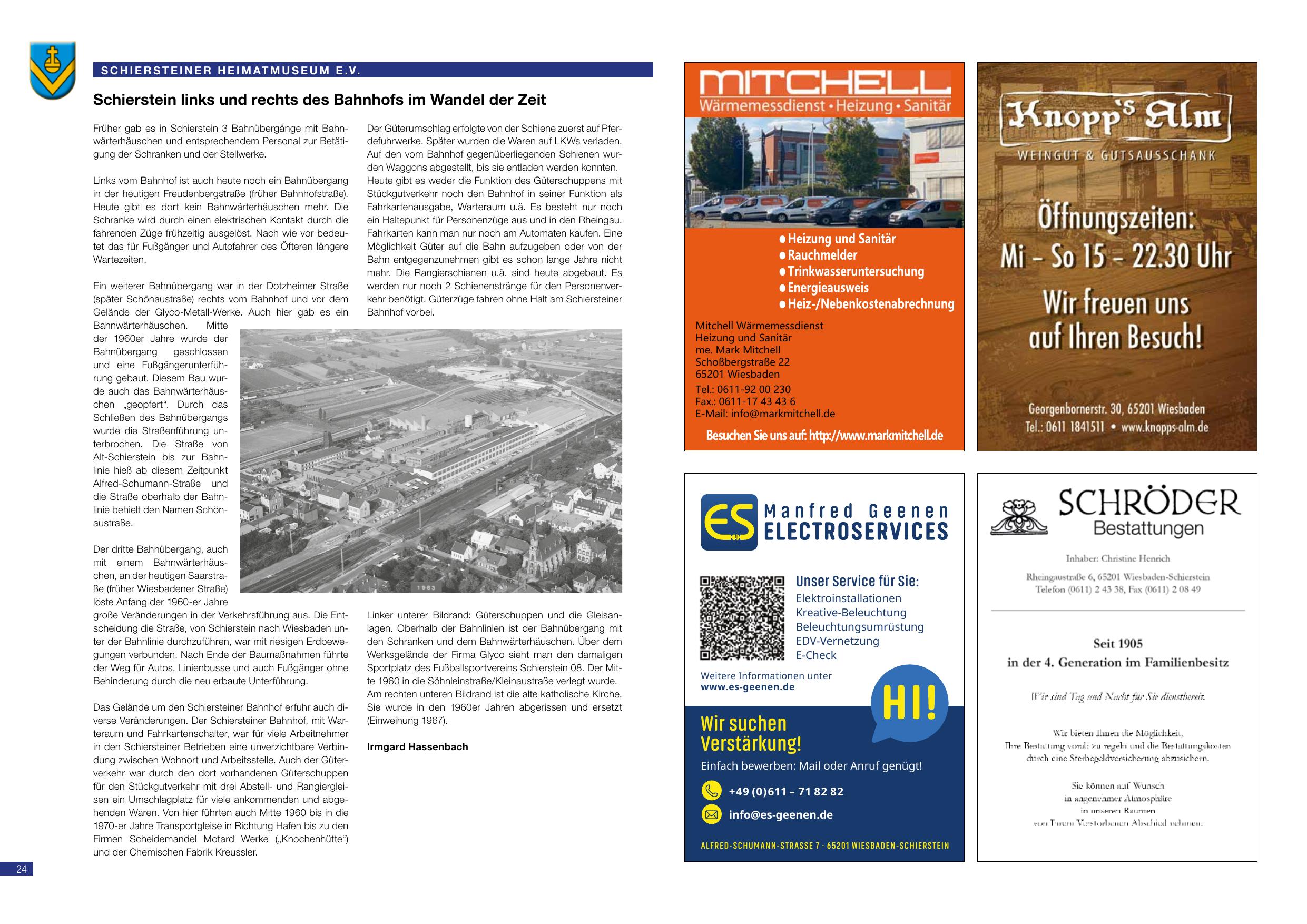 Schierstein links und rechts des Bahnhofs im Wandel der Zeit: Der Artikel von Irmgard Hassenbach beleuchtet drei historische Bahndörfer in Schierstein und ihre Veränderungen über die Jahrzehnte. Der erste Bahnübergang war beim ehemaligen Elektrizitätswerk in der Rheingaustraße. Der zweite befand sich in der heutigen Fußgängerzone (früher Gaststätte Glöckner/Bahnhofstraße) und war Anfang der 1900er Jahre ein Güterumschlagplatz. Der dritte lag an der heutigen Saarsbrückerstraße / Nähe Rheinufer. Die Auflösung der Schiersteiner Bahnanlagen war mit der Übernahme Rheinhessens durch die preußischen Truppen verbunden. Die Bundesbahn brachte schließlich den Weg für Autos und Güter über die Alfred-Schumann-Straße. Autor: Irmgard Hassenbach.
