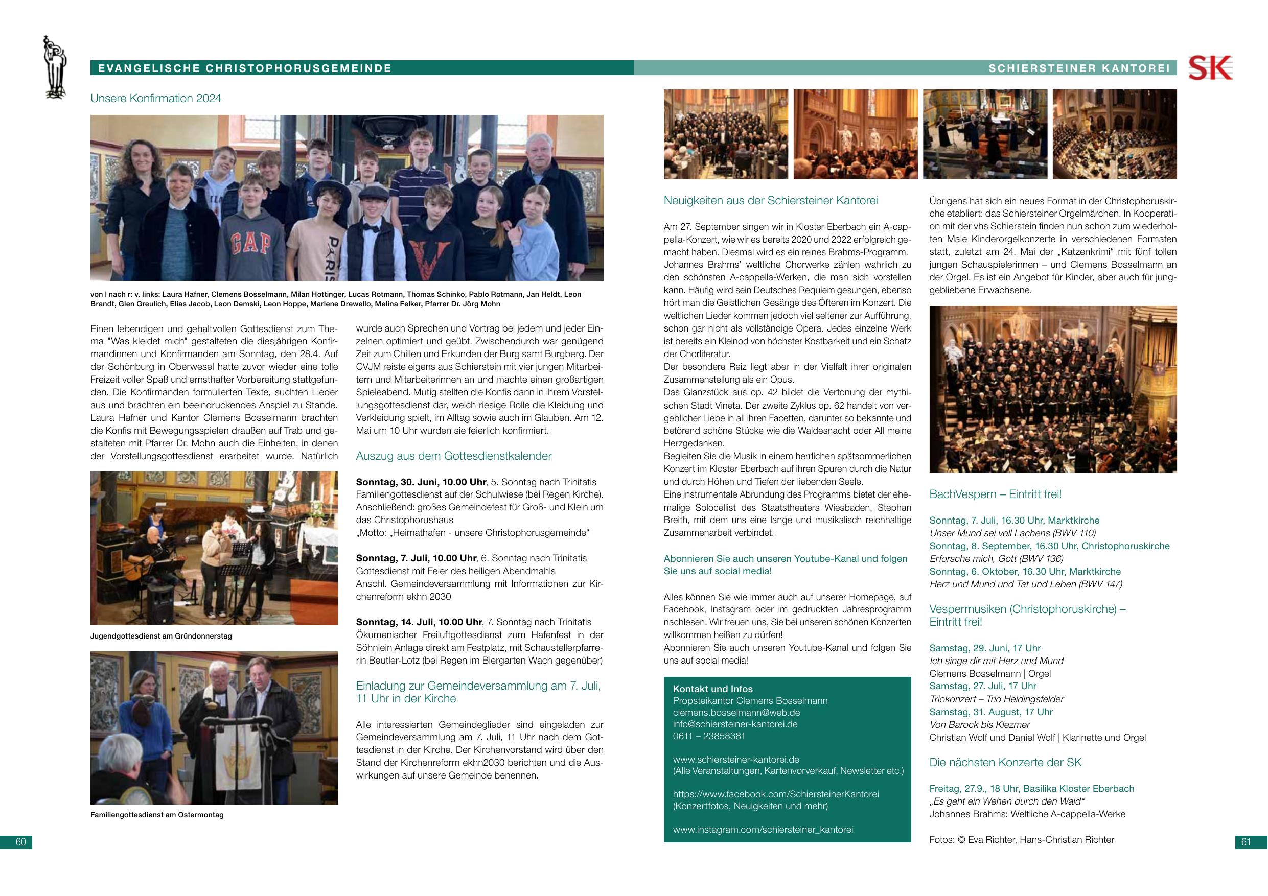 Neuigkeiten aus der Schiersteiner Kantorei: Am 27. September singen ein Kloster Eberbach ein A-cappella Konzert, das es seit bereits 2020 und 2021/22 erfolgreich gab. Chorleiter: Clemens Bossamann bleibt weiterhin tätig. Die Kantorei ist offen für alle Schiersteiner und Begeisterte. Durch Bachmotet und YouTube-Kanal wird das Repertoire erweitert. Das Schiersteiner Kantorei-Bachchor – ein Instrument im Bereich Kirchengesang – spielt Orchester und Gesang zusammen. Der zweite Zyklus hat von der Vielfalt der originalen Zusammenarbeit angefangen. Kontakt: Chorleiter Clemens Bossamann. www.schiersteiner-kantorei.de. Bachvespern (Christophoruskirche): Samstag 6. Juli, 18:30 Uhr – Kantate BWV 105. Vesper (Christophoruskirche): Samstag 21. Juni, 17 Uhr – Messe und Musik.
