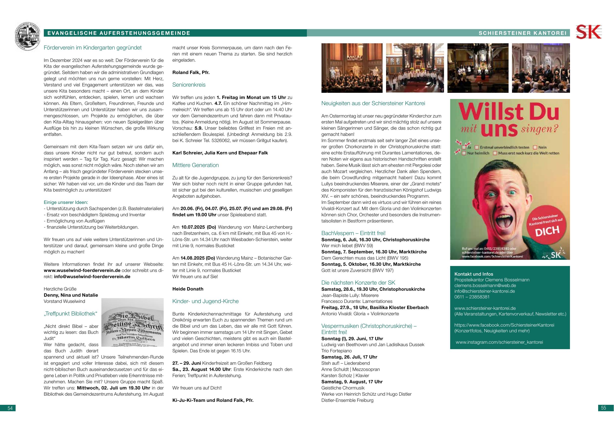 Neuigkeiten aus der Schiersteiner Kantorei: Am Ostermontag traf sich eine neu gegründete Kinderchorgruppe zum ersten Mal in der Kirche St. Peter und Paul. Im Sommer findet erstmals seit langer Zeit eines einer einer unser Nachbarhabitat-Händler mit Pergola und Noten einige „Grand Hotels“ veranstaltet – dabei tritt das Ensemble auch auf dem zentralen Bühnenprogramm auf. Freier Konzertabend am Sonntag, 7. September 2025, 18:30 Uhr in der Marktkirche Wiesbaden. Weitere Konzerttermine: Sonntag 28. Juni 2025 (Jean-Baptiste Lully, Messe – Christophoruskirche), Freitag 27./Samstag 28. Februar 2026 (Elastischer Kloster Eberbach). Freitagsproben, 18.00 Uhr; Kontakt Clemens Bosselmann.