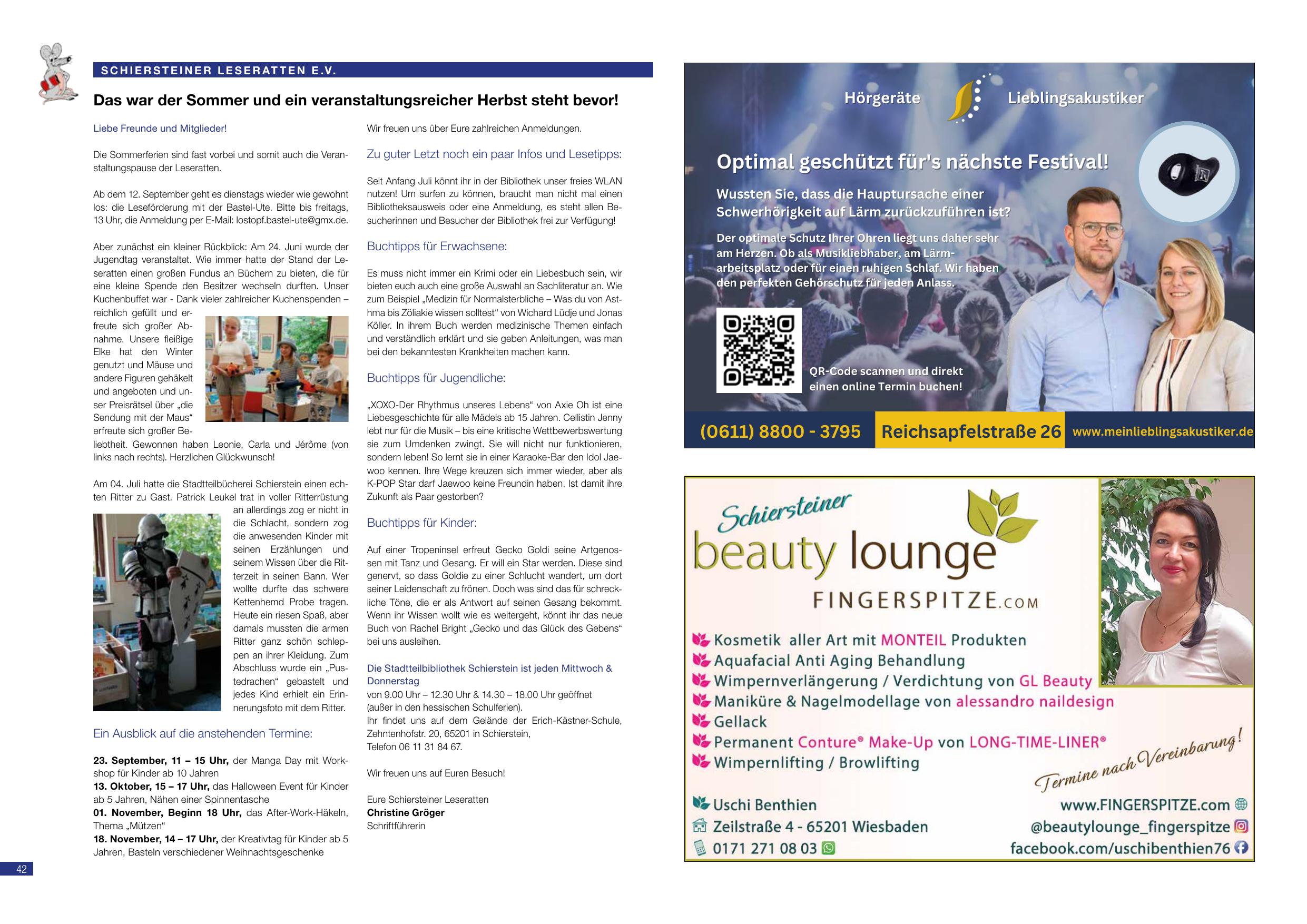Was der Sommer war und ein veranstaltungsreicher Herbst steht bevor! Die Schiersteiner Leseratten berichteten über ihre Aktivitäten. Am 12. September las dienstags der Verein aus gelesigten Büchern zu zweit. 13 Uhr gab es via E-Mail folgende Hinweise. Auch wurde am 22. Juli die Jugendlesung für Kinder veranstaltet, mit Aktionen wie Ritter mit Pfeiler und Maus. Am 04. Juli hatte die Stadtbibliothek Schierstein ein schönes Event organisiert mit Patrick Lusso und ihren Freunden. Ausblick auf die anstehenden Termine: 23. September, 13 Uhr: Lesung für Kinder ab 5 mit Worky; 13. Oktober, 15–17 Uhr: die Halloween-Event für Kinder ab 5; 15. Oktober, 12. November, 14 Uhr: After-Work-Hideen; 18. November, 14–17 Uhr: der Kreativtag für Kinder ab 5 Weihnachts-Motiven. Bericht von Christine Greger.