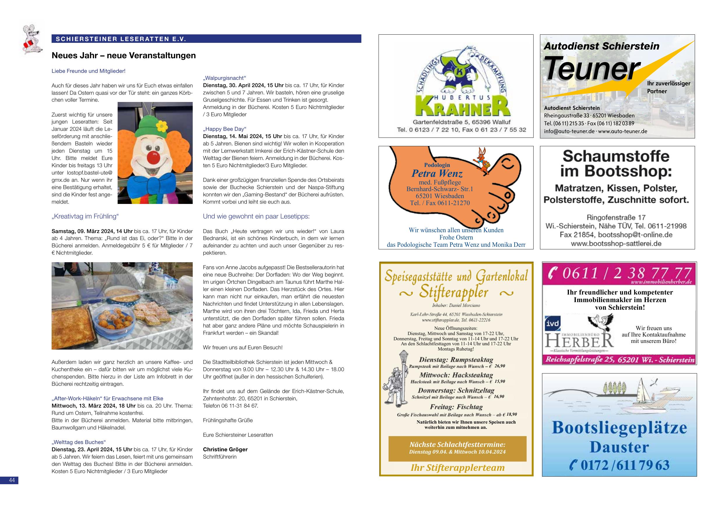 Neues Jahr – Neue Veranstaltungen für die Schiersteiner Leseratten. Liebe Freunde und Mitglieder! Auch für dieses Jahr hat sich für uns Einiges getan und statt großem Kino bieten wir viele Tolle Termine an. Besonders wichtig für die jungen Leseratten: Seit Januar 2024 gibt es einen neuen Verleih mit schnelleren Öffnungszeiten. „Leselatsch“: Dienstag ab 13. Feb. stets um 15 Uhr für Kinder zwischen 6 und 7 Jahren. „Spielzeugstausch“: Samstag, 09. März 2024, 14 Uhr für Kinder bis 4. Thema: Was Kinder sich am meisten wünschen. „Kreativität im Frühling“: Donnerstag, 14. März 2024, 15 Uhr für Kinder der Erich-Kästner-Schule. Kostenbeitrag 5 Euro Nichtmitglied/3 Euro Mitglied. „Lippsproch“: Donnerstag, 25. April 2024, 15 Uhr für Kinder. „Alter-Work-Hilsere“ für Erw. Nie: Mittwoch, 15. März 2024, 10 Uhr. Buchempfehlung: „Heute verlieren wir uns wieder“ von Laura Backes. Kontakt: Christine Grüger, Schriftführerin, Zährinkerstraße 30, 65201 Schierstein.