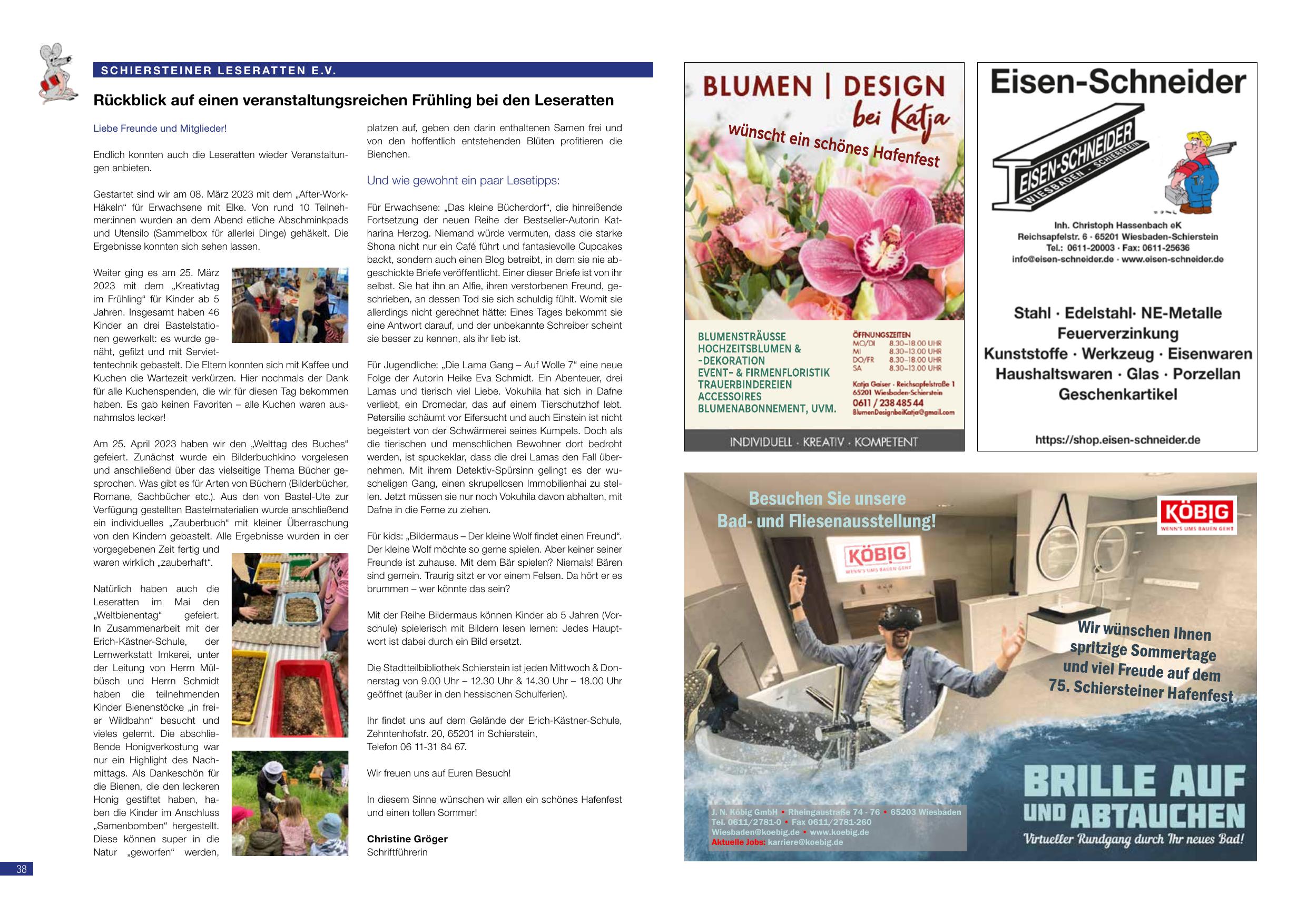 Rückblick auf einen veranstaltungsreichen Frühling bei den Leseratten: Die Leseratten berichten über verschiedene Veranstaltungen. Gestartet wird am 08. März 2023 dem „After-Work-Abend“ für Erwachsene mit den Eban vom 10. bis 60. Jahr. Dann wurden wir von Bibliotheks-Abend durchgeführt. Am 20. März 2023 dem „Kreativabend Frühling“ für Kinder — ab 3 Jahren, im Hof wurde geschrieben. Das Programm kommt diese Ausgabe der Bestseller-Autorin Katharina Herzog und beschrieb Katia. Für Jugendliche: Die „Lama Gang — All Risdie 7“ mit einer neuen Folge. Für Kinder: „Bildermaus — Die kleine Wolf findet einen Freund“. Lernwerkzeug an der Erich-Kältner-Schule — Stadtbibliothek Schierstein ist jeden Mittwoch und Donnerstag von 10:00 — 12:00 Uhr und 14:30 — 15:00 Uhr. Schriftführerin: Christine Gröger.