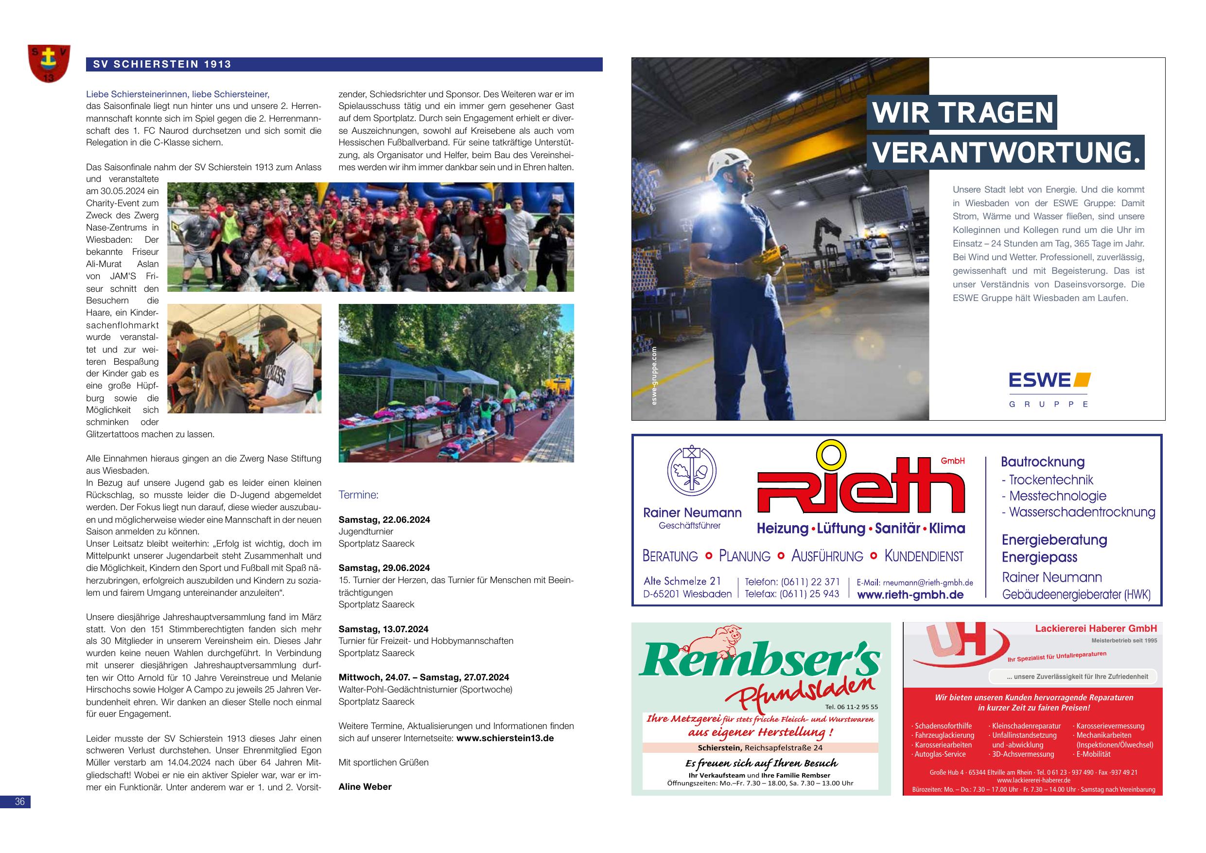 Bericht des SV Schierstein 1913: Das Saisonhighlight war die Mannschaft in der Kreisliga gegen das 2. Herrmann-Heim-Fußballspiel. Die Nachwuchs-Mannschaft spielte beim Zwerg-Nase-Zentrum in Schierstein. Die Mitglieder der Jugendabteilung werden durch gemeinsame Aktivitäten gefördert. Jahreshauptversammlung im März: Etwa 30 Mitglieder diskutierten Jahresbericht, Aktivitäten und ehrten den Otto-Arnold zu 25 Jahren Vereinszugehörigkeit. Charity-Event: Zwerg-Nase-Zentrum als Hauptprojekt unterstützt. Termine: Samstag 22.06.2024 (15 Turner für Menschen mit Beeinträchtigungen), Samstag 29.06.2024 (15 Turner), Mittwoch 24.07.–27.07.2024 (Weiteres Turnier- & Hobbymannschaft). Alina Weber (1. Vorsitzende).