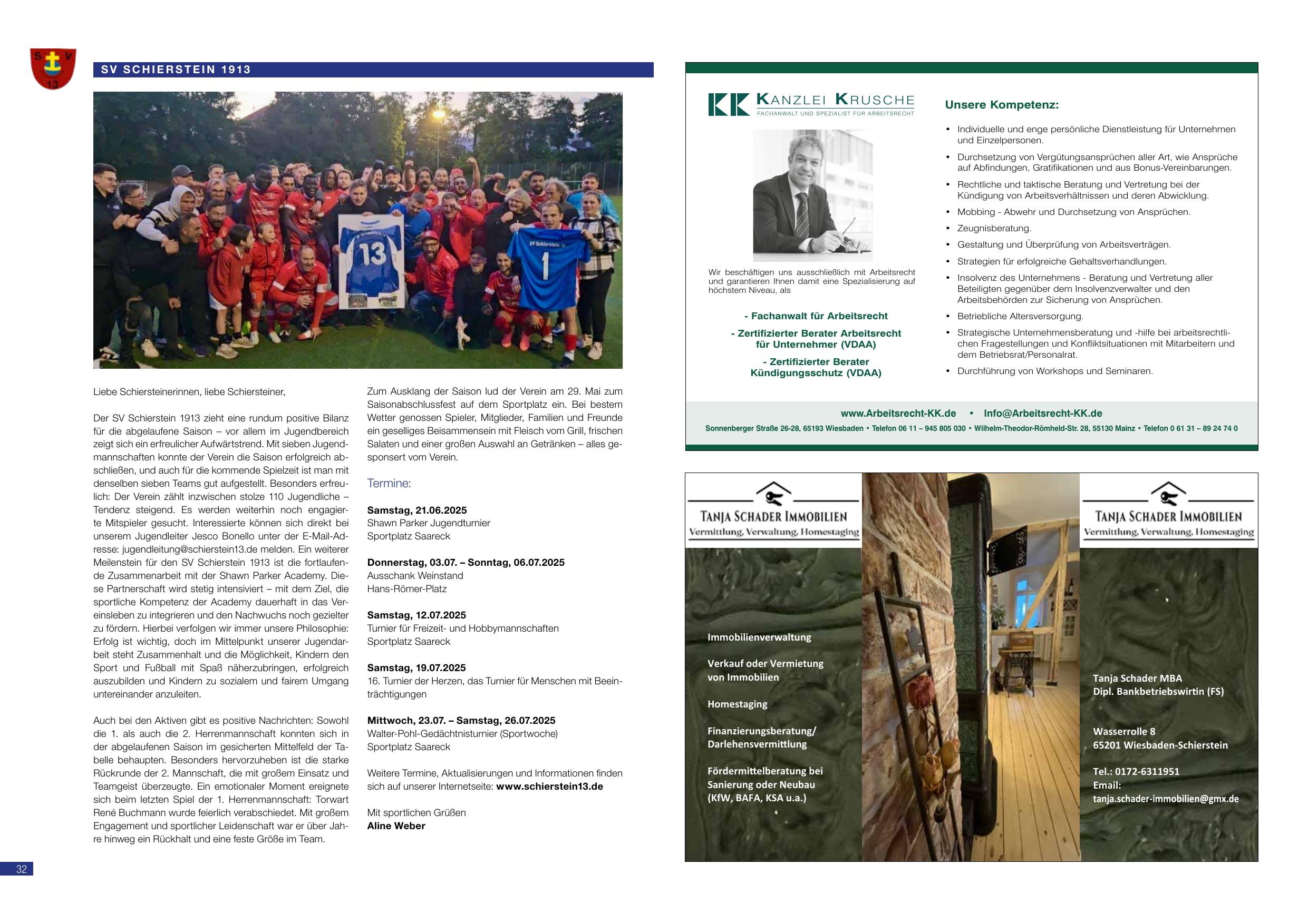 Der SV Schierstein 1913 gibt eine rundum positive Bilanz für die abgelaufene Saison bekannt. Trotz personeller Einschränkungen konnte der Verein seine Aktivitäten weiterführen und den Zusammenhalt stärken. Besonders erfreulich war die Entwicklung der Jugend – nach dem frühen Rückstand konnte die U-17 zum Saisonende fast alle Spiele gewinnen. Im Vorstand ist jetzt die Zusammenarbeit mit dem Shaun Parker Jugend-Zentrum als sportliche Kooperation etabliert, um soziale Kompetenz zu stärken und Kinder und Jugendliche in sportliche Intergration einzubinden. Termine: Sportfest Saareck am Samstag 21.06.2025 (18:00 Uhr), Spieltag am Sonntag 08.07.2025 (12:00 Uhr), Turnier am Samstag 12.07.2025, Turnier für Menschen mit Beeinträchtigung am Samstag 19.07.2025, Sportwoche 23.07.–26.07.2025 (Sportplatz Saareck). Alma Weber.