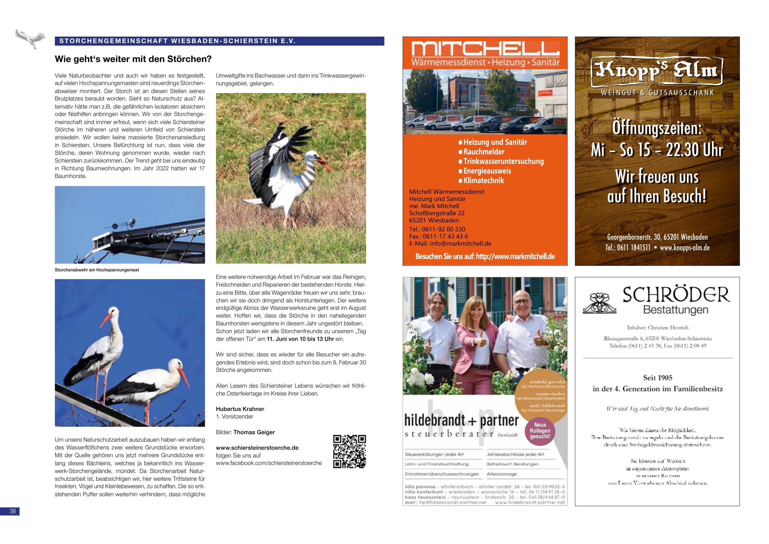 Wie geht’s weiter mit den Störchen? Alle Naturbeobachter und neugierigen Schiersteiner haben es festgestellt, auf allen Hochspannungsmasten um den roten Haken ist ein Storch zu beobachten, der erst mal alle Störche an diesem Platz oder von den Brutplätzen abstoßen oder reparieren möchte. Klar ist so im näheren und nächsten Umfeld von Schierstein wird immer gefragt, wie viele Störche kommen. Nach guter Beobachtung weiß die Bevölkerung nicht, wer viele Störche aus Schierstein in die Frühjahrsferien zurückkehren werden. Im Jahr 2022 hatten wir 17 Brutmörster. Eine unbeabsichtigte Zusammenkunft der Vereinsmitglieder am 9. Dezember 2022 hat ergeben, dass 21 Mitglieder und ihre Familien an verschiedenen Tagen die Storchen-Beobachtungen beobachteten. Nachwuchssitzung: Am 03.02.2023 war in den „Aktivitäten-Ausflug“ und Stammtisch der Mitglieder vom Schiersteiner Storchen in einem FM-Wärmespeise bekannt. Das nächste regelmäßige Treffen für Besucher ist „offenen Tür“ am 11. Juni von 10:00 bis 13:00 Uhr. Allen Lesern des Schiersteiner Lebens wünschen wir eine möge Ostern-Freude im Kreis Ihrer Freunde! Schriftführer: Thomas Geiger. Vorsitzende: Katharina Krahmer.