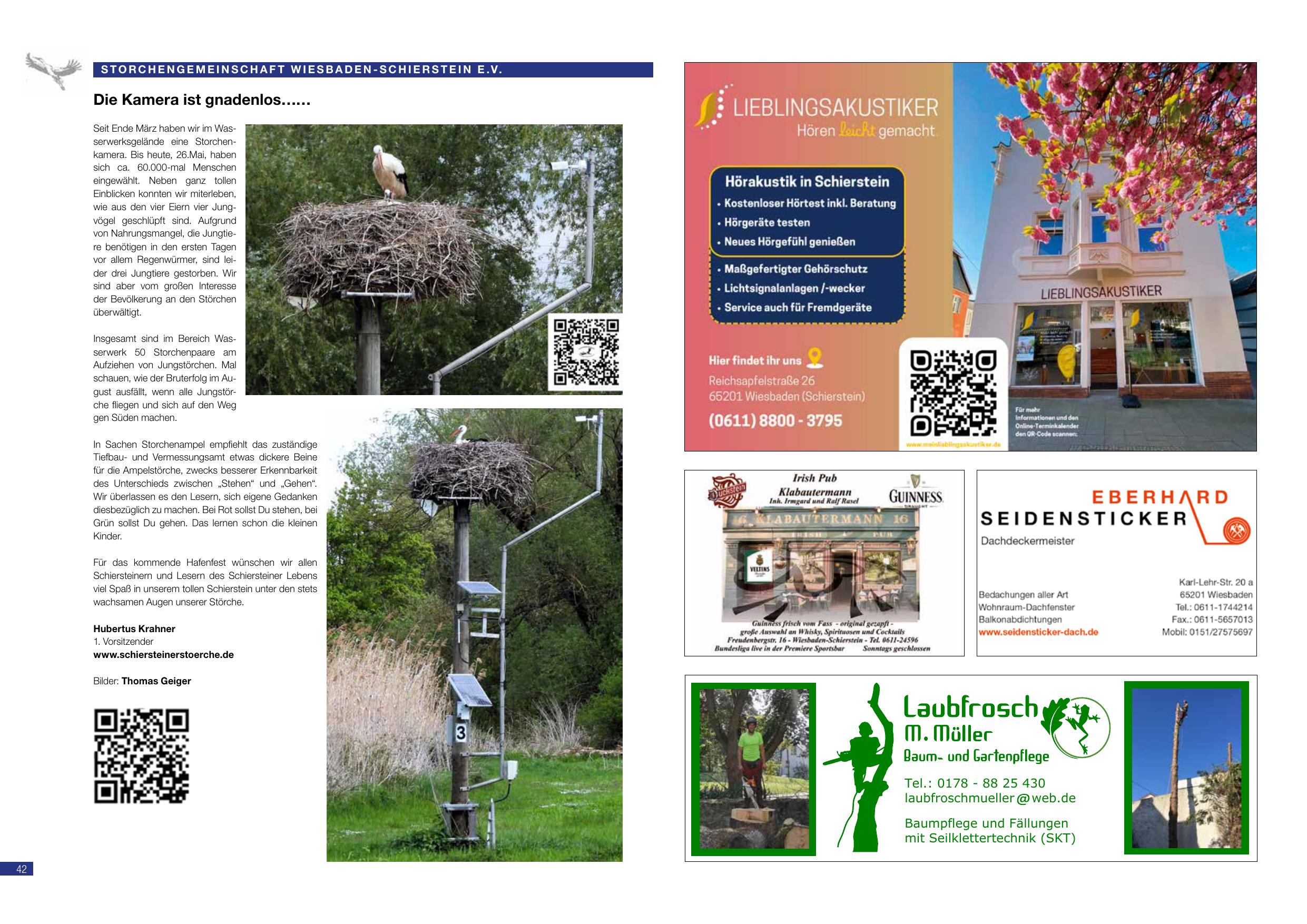 Die Kamera ist gnadenlos: Seit Ende März haben im Wiesbadengebäude eine Storchenbrutkamera. Bis heute haben ca. 60.000–70.000 Menschen hineingeschaut. Es wurden insgesamt 30 Störche aus der Region in wenigen Tagen gezählt. Aufgrund von Regenmangel sind die Jungen in einigen Tagen der Brutsaison gefährdet. Insgesamt konnten drei Jungstörche gezählt werden. Am Sonntag können wir die Storchenecke mit einer Kameraführung beobachten. Das laufende Hafenfest wünscht allen Schiersteiner Lesern des Schiersteiner Lebens viele Freude. Wir laden ein, Bilder auf schiersteiner-stoerche.de hochzuladen. Hubertus Krämer, 1. Vorsitzender.