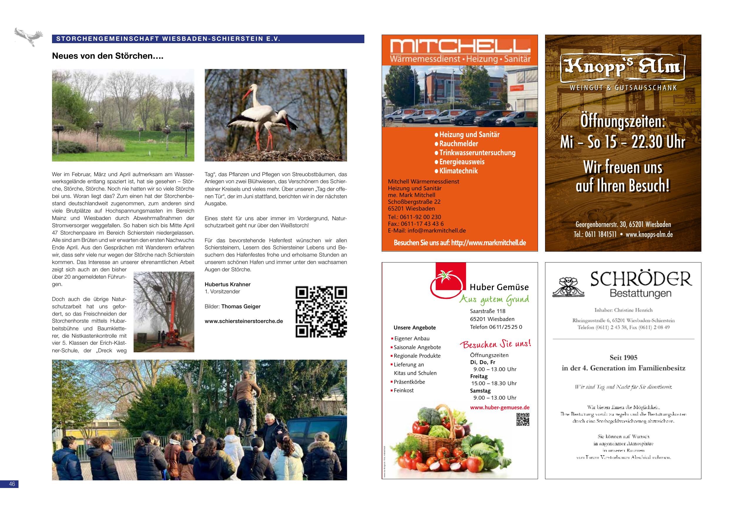 Neues von den Störchen: Im Februar, März und April aufmerksam auf Wasservögelzählung in Schierstein. In diesem Jahr lagen 47 Storchenpaare im Bereich Schierstein vor. Die Schiersteiner Störche werden von Abwehrmaterialien aller Stromversorger weggehalten. Für das besondere Hafenfest wünschen die Störchengemeinschaft allen Schiersteinerinnen und Schiersteiner frohe und erholsame Stunden. Schirmherrschaft hat die Druck-Schule mit Klasse 5, der Naturschutzbeauftragte Hubertus Krahner organisiert die Storch-Beobachtungen. Thomas Geiger (Bilder). www.schiersteinerstörche.de.