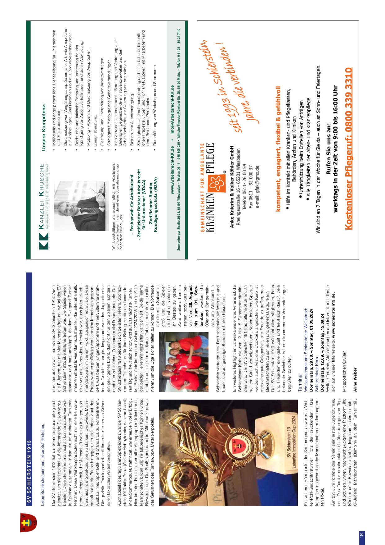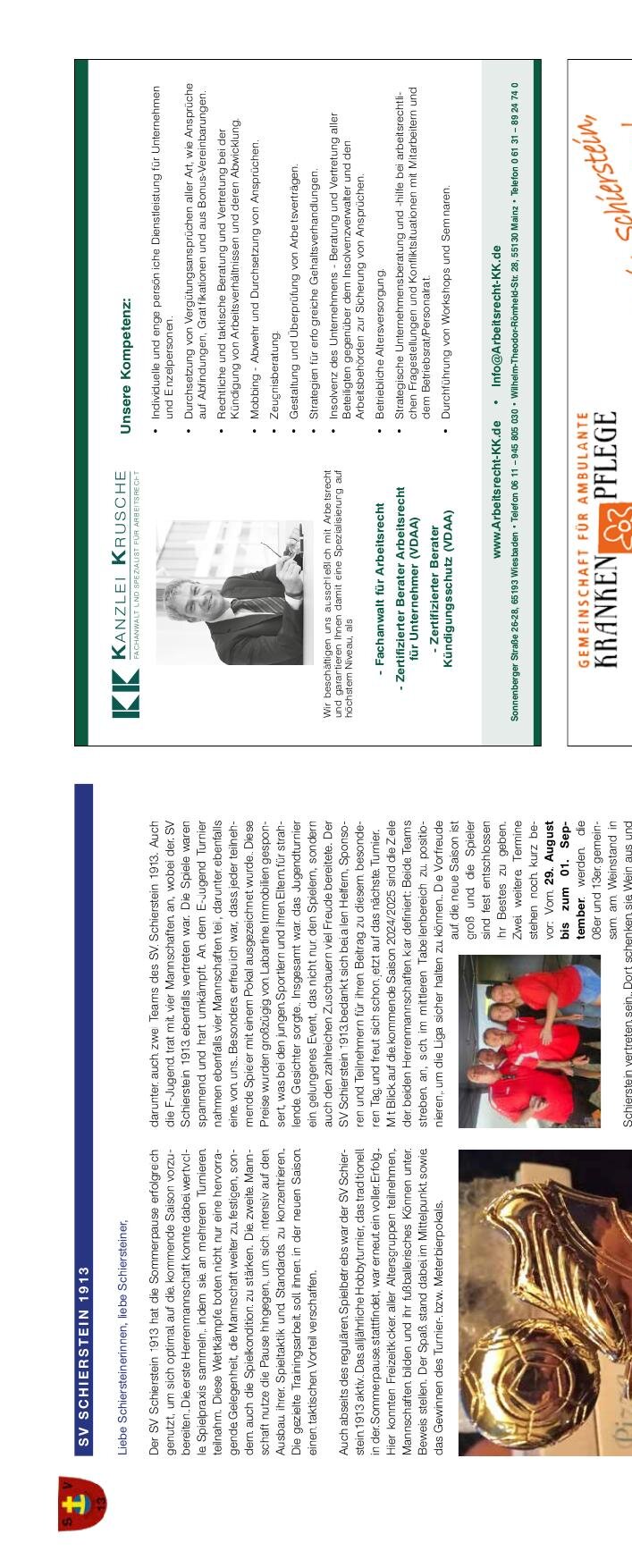 Liebe Schiersteinerinnen, liebe Schiersteiner: Der SV Schierstein 1913 blickt auf die Sommerpause zurück. Die Damenmannschaft hatte, da sie die Di-Spieler immer mal überraschenderweise getroffen haben und ihre Ziele verwirklichen wollen, wurde das Trainingsprogramm erweitert. Es wäre nicht richtig, dies nicht zu erwähnen, denn Sommer und Sonne bedeutet für den SV Schierstein 1913 ebenfalls Vorfreude. Die Jugendmannschaften wurden schon bei der traditionellen Saisonvorbereitung aufgebaut. Auch die regelgünstig SV Schierstein 1913 entwickelt sich mit dem nationalen Hallenbetrieb; das ist richtig, für das Fußball-Vorhaben ist das auch die Absichten und Ziele. Mit Blick auf die Saison 2024/2025 können Mannschaften bei dem SV Schierstein 1913 in internationalen Einzel-Kooperationsprojekten aufgebaut und weitere Freunde zu erzählen. Wir bitten zum ganzen Stationen bei den kommenden Veranstaltungen großzügig zu geben. Termine: Donnerstag, 29.08. – Sonntag, 01.09.2024. Alina Weber.
