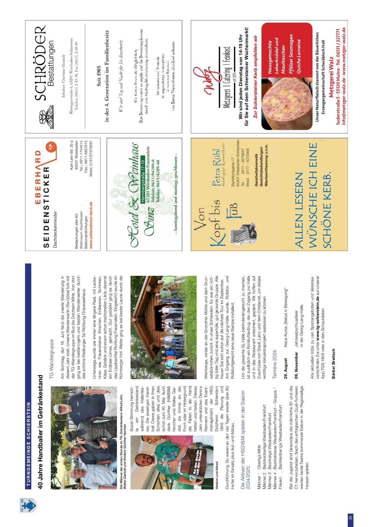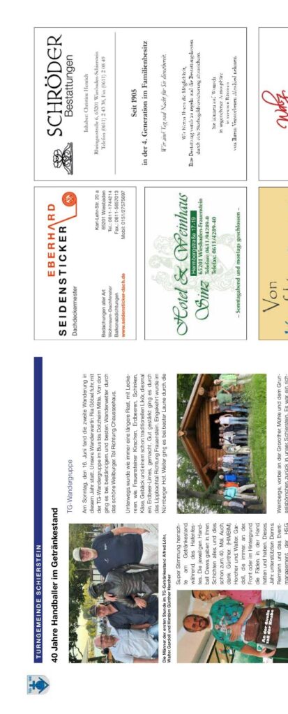 40 Jahre Handballer im Getränkestand: Die Turngemeinde Schierstein berichtet: Am Sonntag, dem 16. Juni fand die zweite Wanderung der TG Wandergruppe statt. Im Bus bis Dot dem Mühle reisten die Mitglieder der TG-Wandergruppe gemeinsam. Von dort nach Nürnberg-Hof. Wandergruppe vorb. Gradnitz Müller und dem Grundstück auf der gelungenen Schlossmühle auf der jetzigen Route im September. Auf den ganzen Wanderziel kam ein schöner Aussichtspunkt in der Nähe des Nürnberger Hotel. Walter ging es bis zum schönen Lorch und einem Blick. TG-Wandergruppe: Neue Kurse, „Babys in Bewegung“ unter Georg-Lang-Halle. Termine 2024: 29. November, App TG 1846 oder in den Schaukästen. Bärbel Breisch.