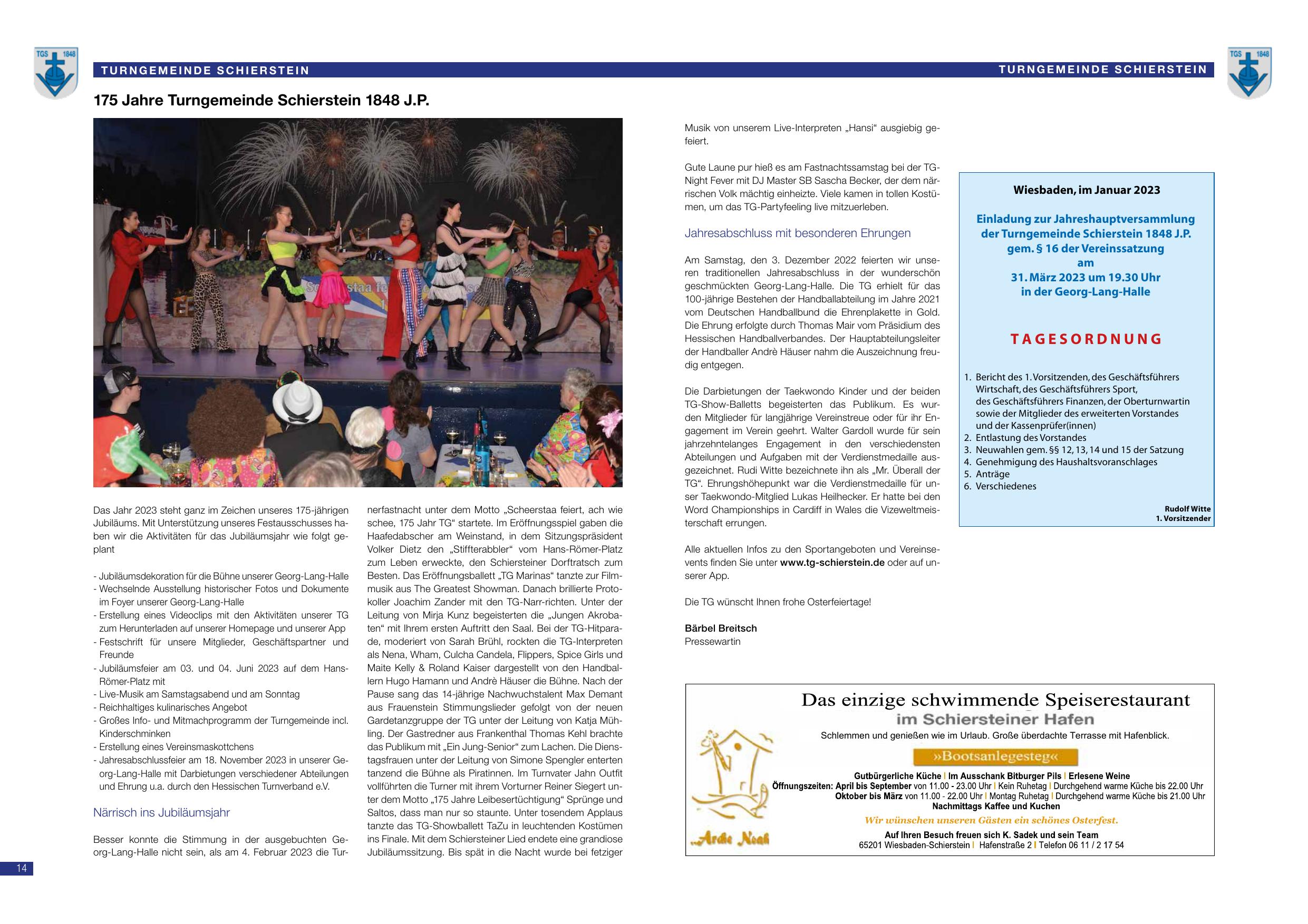 175 Jahre Turngemeinde Schierstein 1848 J.P. Das Jahr 2023 steht ganz im Zeichen unseres 175-jährigen Jubiläums. Die TG Schierstein plant folgende Aktivitäten für das Jubiläumsjahr: Wechselnde Ausstellungen historischer Fotos und Dokumente im Foyer unserer Georg-Lang-Halle; Einladung eines Vortrags/Referenten zum Aufkommen unserer TG im Herbst 2023 als Festschrift; die Mitglieder arbeiteten über das Herbst 2023 Jahresabschlussfest der TG-Schierstein. Es waren die Aktivitäten für knapp 90 Personen in der Schiersteiner TG-Halle. Die TG hat dabei für Kinder zwischen 7 und 6 Jahren etwas zu übernehmen gehabt. Aufgrund eines Motorschadens war die Halle für alle zwar gesperrt, konnten die Kinder jedoch auf Mitgliederunterstützung bauen. Im Besonderen möchte man die TG-Mitglieder, die auch Mitglieder für Jahrespräsentationen und -ehrungen haben. Das TG-Jubiläum wird ein gesellschaftliches Ereignis. Jahreshauptversammlung am 31. März 2023 um 19:00 Uhr in der Georg-Lang-Halle. Tagesordnung: 1. Bericht der Vorstände, des Geschäftsführers, Wirtschaft, des Geschäftsjahres Sport; 2. Die Darstellungen der Kassenprüfer; 3. Bericht der/des gewählten Vorstandes; 4. Neuwahl/Wahl der Satzung §§ 12, 13 und 13 der Satzung; 5. Berichte der Abteilungsleiterinnen und Abteilungsleiter.