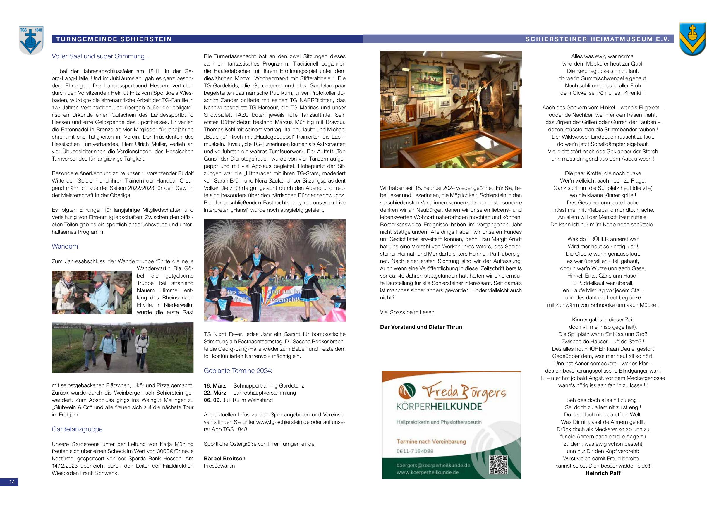 Voller Saal und super Stimmung beim Jahresabschlussfest der Turngemeinde Schierstein am 18.11. in der Gerlog-Lang-Halle. Zum Jubiläumsprogramm gab es gut 500 Besucher. Die Turngemeinde dankt Rudolf Bauer für über 25 Jahre Vorstands- und Verbandsarbeit. Besondere Ehrung von 1 Vorstandsmitglied. Der Turnierfastnacht wurde traditionell mit Tänzerinnen und Turnern beliebt. Neu ist die Wandergruppe Rh. Göbel, die diese Wandergruppe initiiert und entlang des Rheins nach Oestrich-Winkel eine Fahrradtour durchgeführt hat. Zum Jahresausklang wurde das Wanderfest mit selbstgemachten Pfälzern, Glick-und Pizza gemacht. Geplante Termine 2024: 16. März – Schnapperturnier Gardetanz; 16. März – Jahreshauptversammlung; 06. Juli – Tag im Weinland.