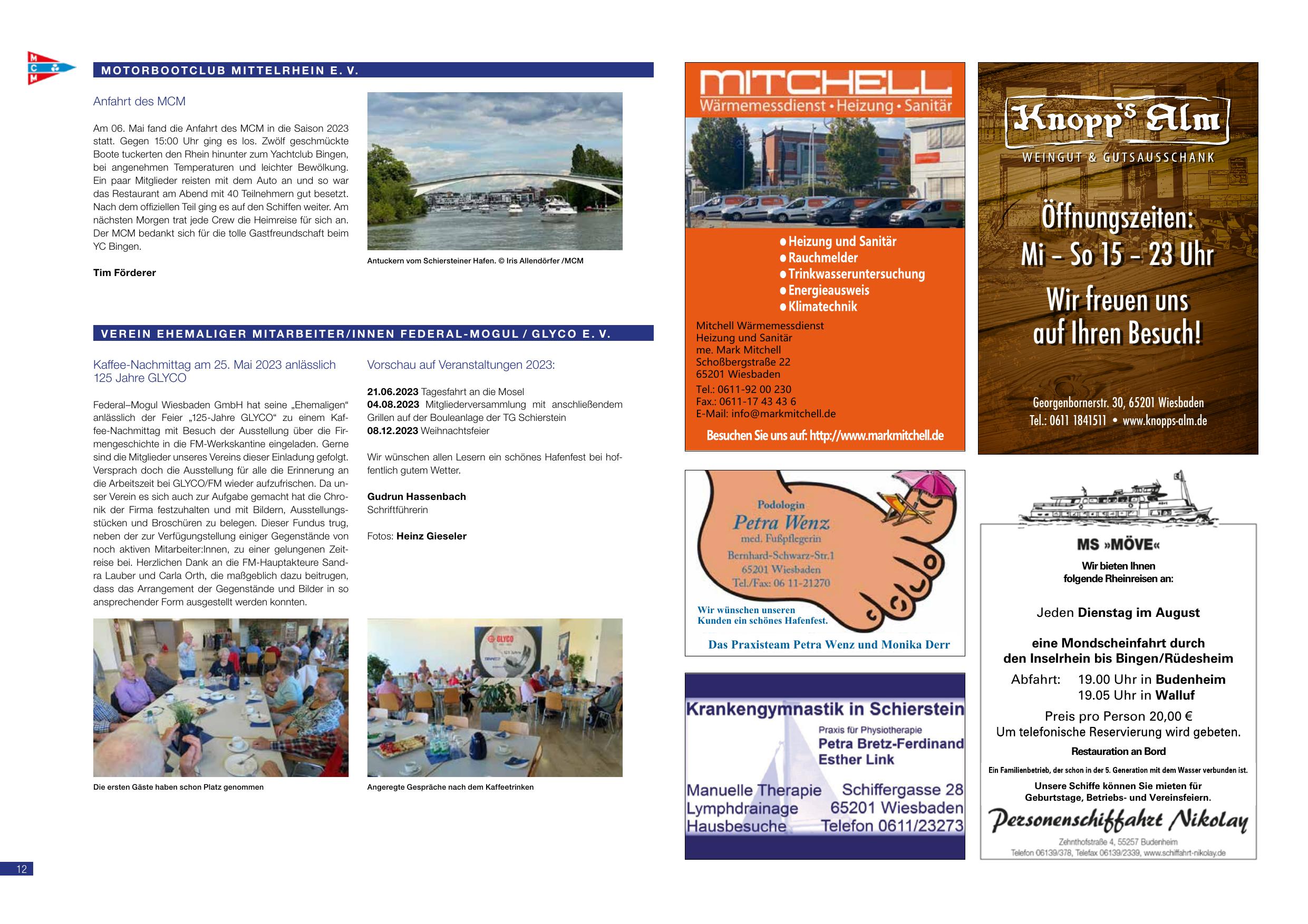 Kaffee-Nachmittag am 25. Mai 2023 anlässlich 125 Jahre GLYCO: Der Verein ehemaliger Mitarbeiterinnen und Mitarbeiter von Federal-Mogul/Glyco lud anlässlich des „125-Jahre-GLYCO“ zu einem Kaffee-Nachmittag ein mit Besuch der Ausstellung für die aktuellen und die Mitglieder unseres Vereins. Besprochen wurden Erinnerungen an die Arbeitsplätze bei GLYCO/FFEM-wieder aufzufrischen. Vorschau auf Veranstaltungen 2023: 21.06.2023 Mitgliederversammlung mit anschließendem Grillen auf der Bouleranlage der TG Schierstein; 08.12.2023 Weihnachtsfeier. Schriftführerin: Gudrun Hassenbusch.
