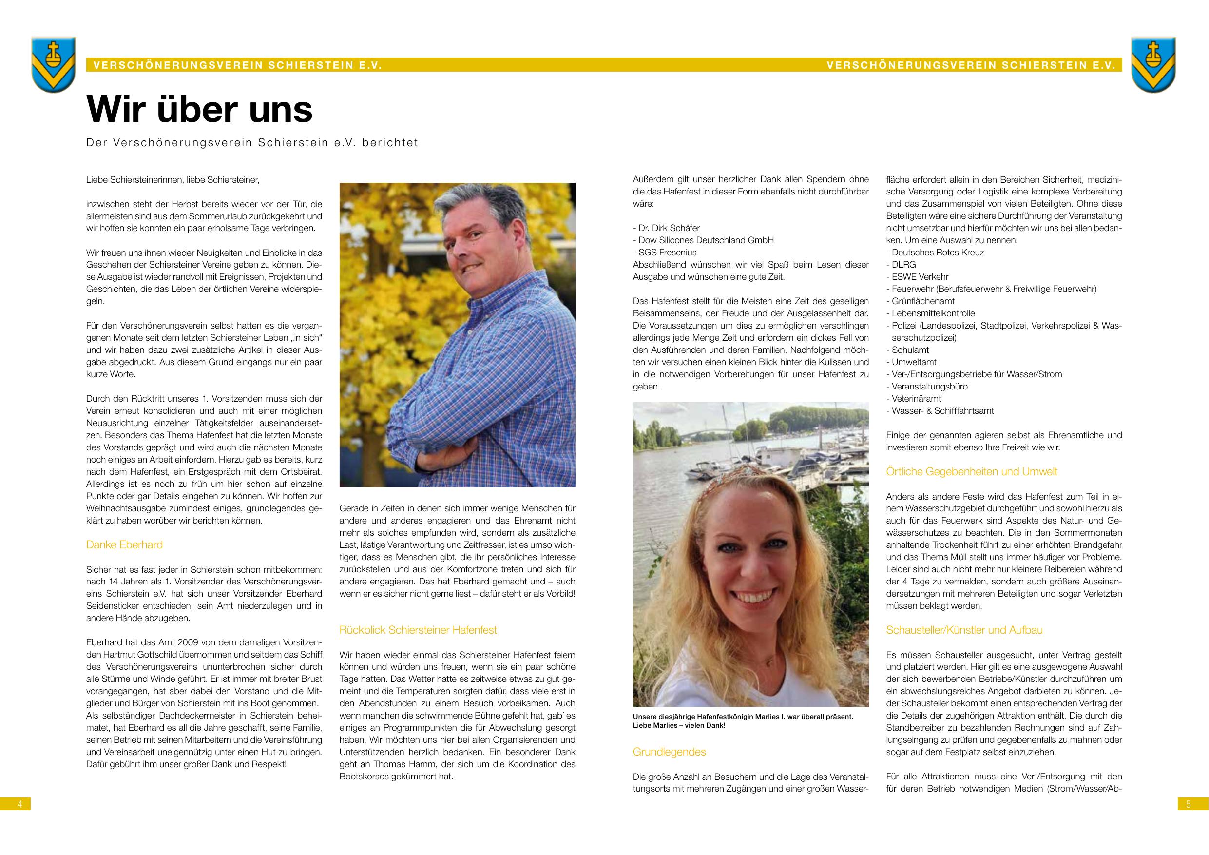 Der Verschönerungsverein Schierstein e.V. berichtet über das vergangene Halbjahr. In diesem Jahr konnte der Verein wieder viele Veranstaltungen organisieren und die Ortsverschönerung vorantreiben. Die Hauptveranstaltung war erneut das Weihnachtskrippenfest am 24. November 2023 sowie der Besuch des Nikolaus am 6. Dezember 2023. Der Vorstand, unter Leitung von Martin Gröger, hat nach 24 Jahren die Geschäftsführung an Elberhart übergeben. Der Verein engagiert sich für die Pflege des Ortsbildes, organisiert Veranstaltungen und vernetzt die Schiersteiner Vereine. Neue Mitglieder sind herzlich willkommen. Außerdem appelliert der Vorstand an die Bevölkerung, Spenden für das Haltefest in dieser Form abzuführen und gerne nach Mecklenburg zu gehen. Der Verein freut sich über zahlreiche Unterstützung.
