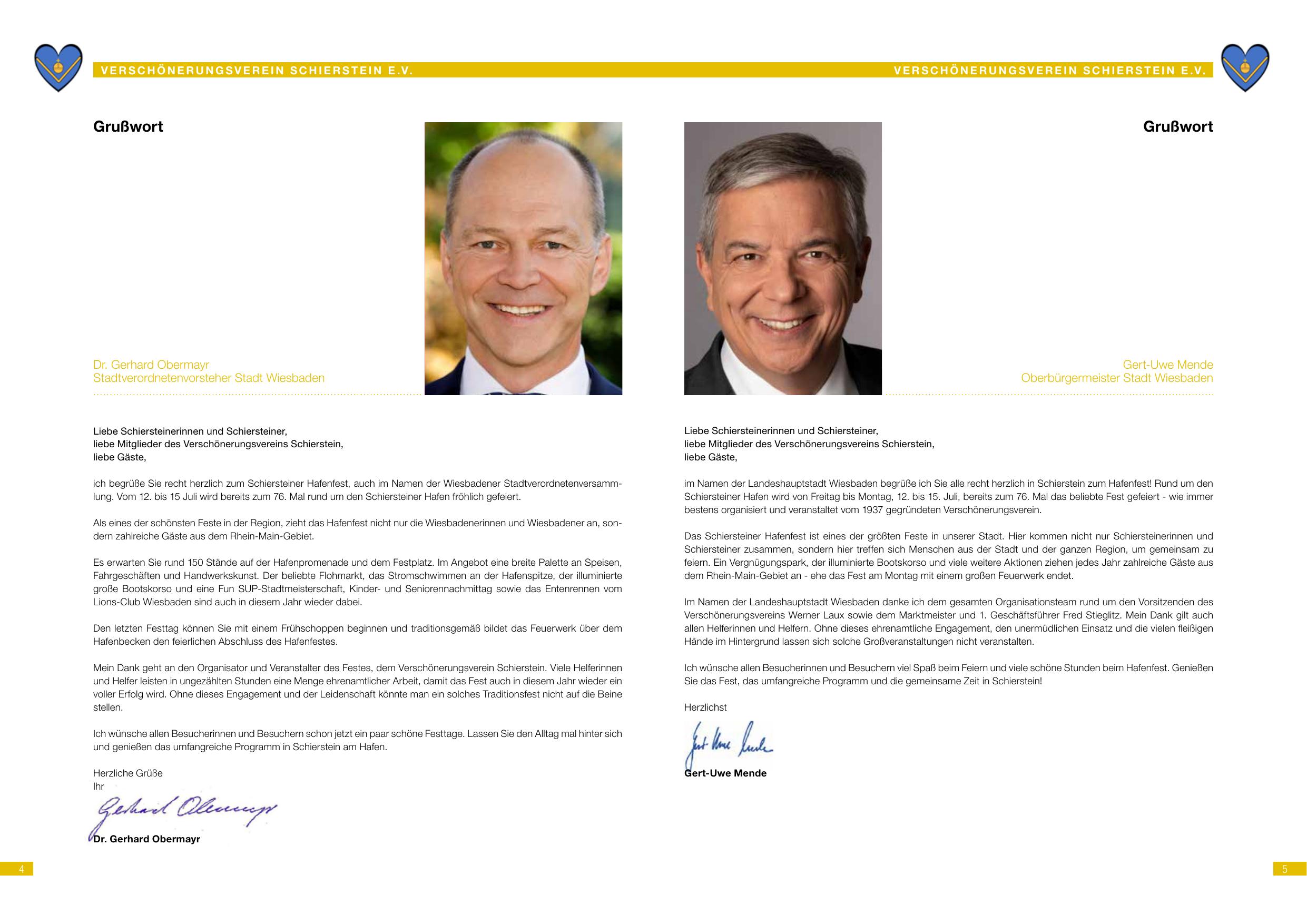 Grußwort des 1. Vorsitzenden Werner Laux sowie des Wiesbadener Bürgermeisters Dr. Gerhard Obermayr und Oberbürgermeisters Gert-Uwe Mende zum 76. Schiersteiner Hafenfest (12.–15. Juli 2024). Der Verschönerungsverein organisiert das Hafenfest bereits seit über 75 Jahren. Bericht über das „Blumenschiff“ Schierstein: Seit 2021 übernimmt die Vorstandschaft unter Robert Laux die Pflege und Betreuung des historischen Schiffs an der Rheinpromenade, darunter die Bepflanzung und das Aufstellen von Blumenkästen. Pflegebeirat Marco Müller koordiniert die Bepflanzung. Vorstand: Werner Laux (1. Vorsitzender), Tanja Schader (2. Vorsitzende).