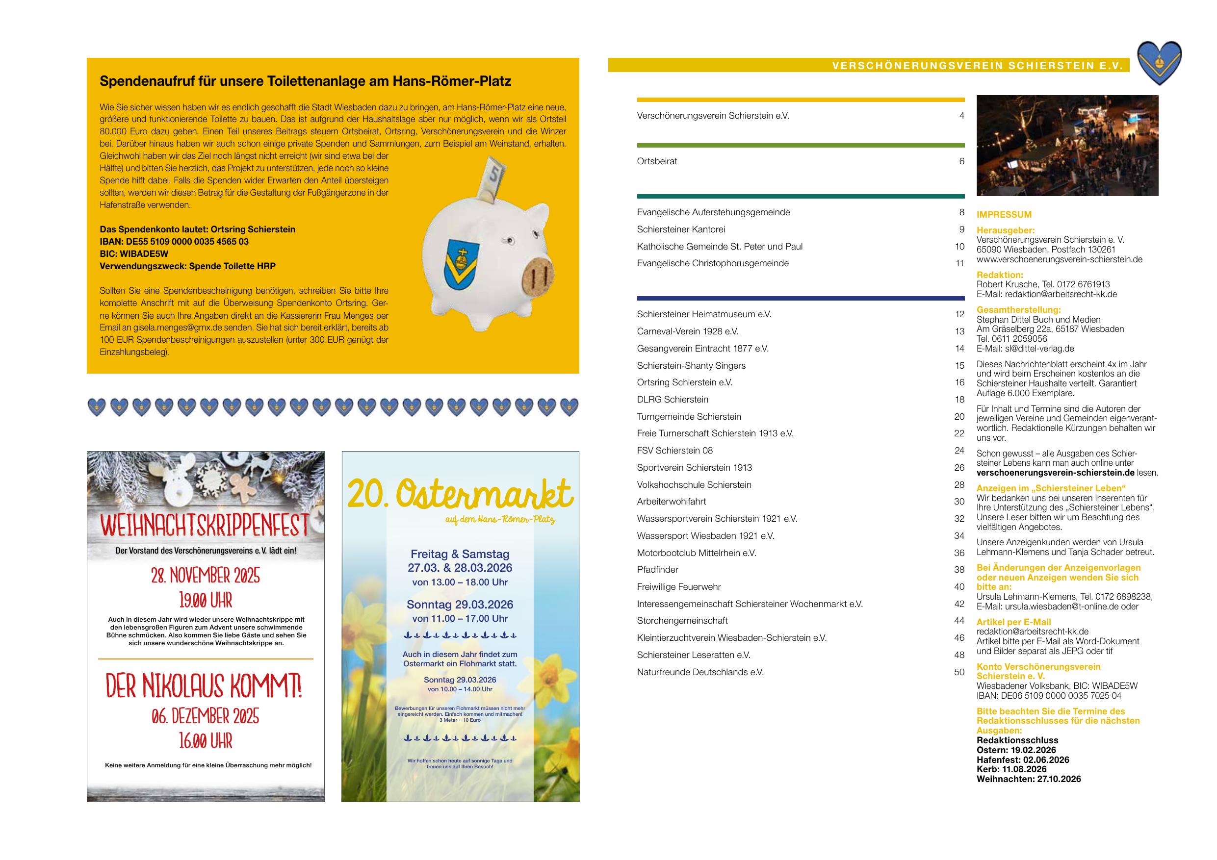 Schon gewusst – Die Ausgaben des Schiersteiner Lebens kann man als PDF unter www.vvschierstein.de herunterladen. Im nächsten Jahr der Nikolaus an den Hans-Römer-Platz. Anmeldung ist am 10.11.2025 für Kinder bis zu 6 Jahren unter nikolaus@vvschierstein.de. Die Plätze sind begrenzt.