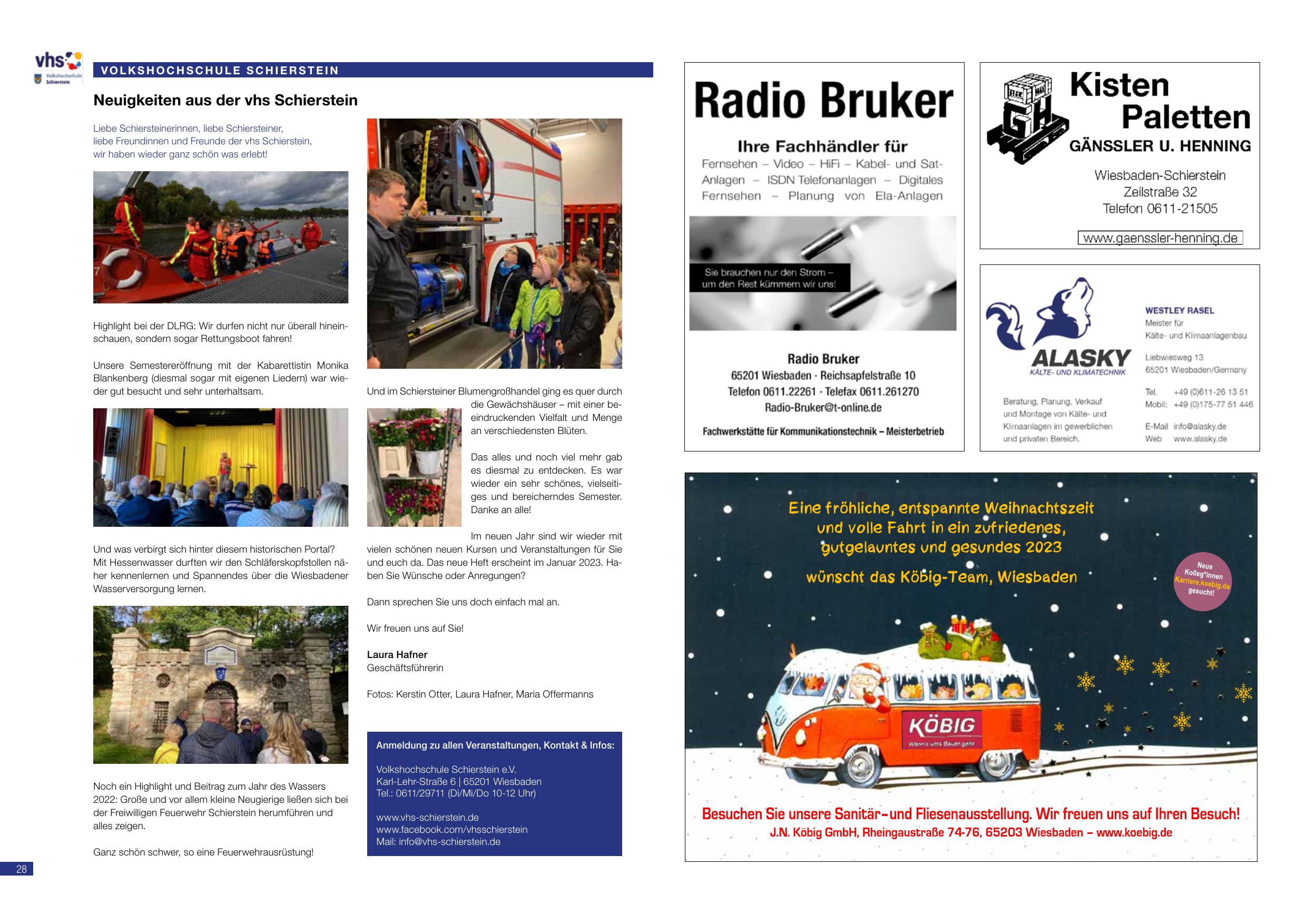 Die VHS Schierstein berichtet Neuigkeiten: Highlight bei der DLRG – die Besucher durften auf der Reiseflotte schauen, sogar auf einen Motorrettungskreuzer. Im Schiersteiner Blumengärtnerladen gingen die Besucher durch einen beeindruckenden Vielfalt und Menge an verschiedenen Blumen. Im neuen Jahr möchte die VHS wieder ein tolles, schönes und beliebtes Angebot für alle bieten. Semesteröffnung mit der Kräuterkollegin Monika Blankenberg am 13.12.2022. Anmeldung für alle Veranstaltungen, Kontakt & Infos: Karl-Luke-Straße 38, 65201 Wiesbaden, Tel. 0611 444 1841, www.vhs-schierstein.de, Mail: info@vhs-schierstein.de. Geschäftsführerinnen: Laura Hafner, Kerstin Ohler, Laura Hafner, Maria Oftenmann.
