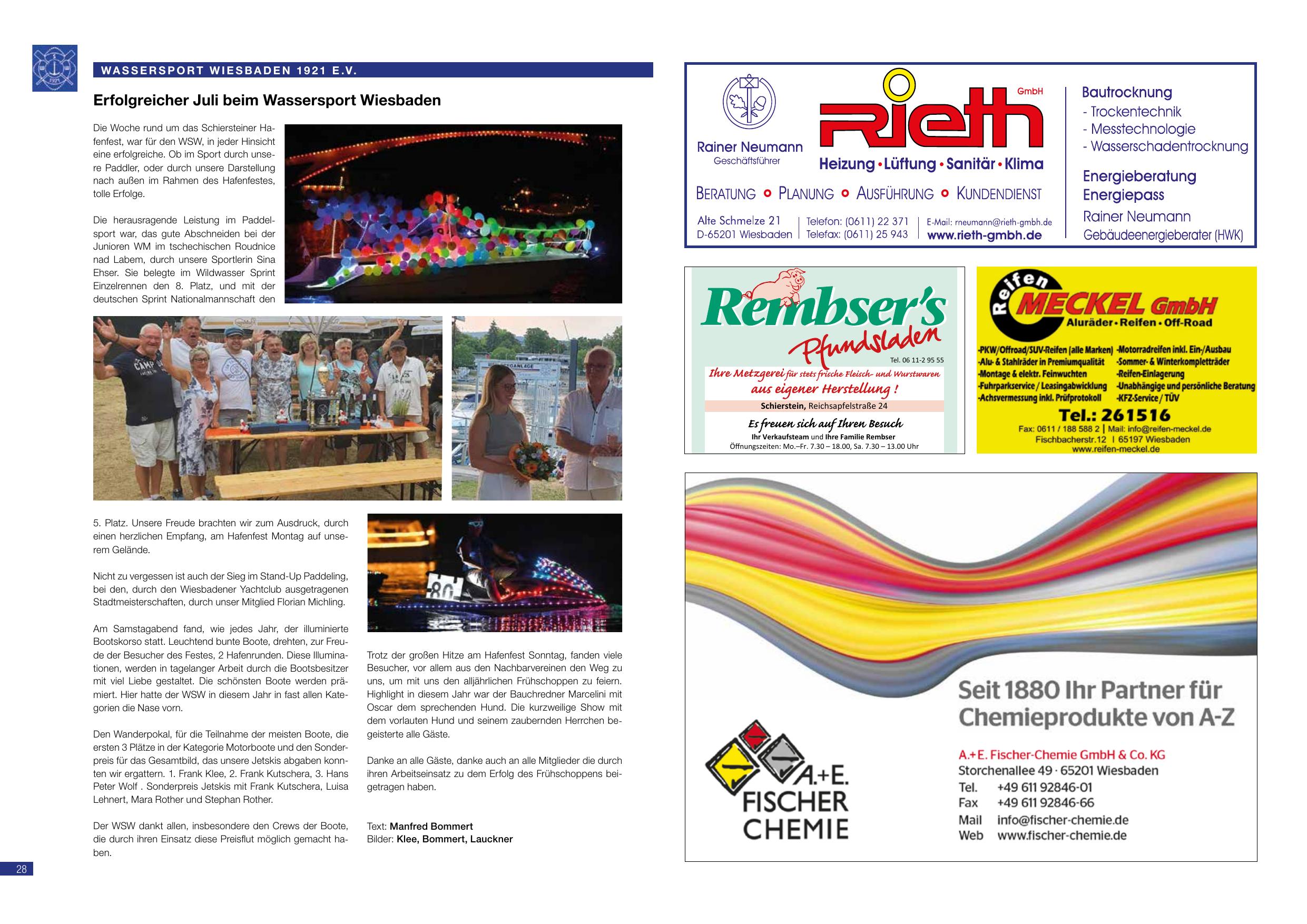 Erfolgreicher Juli beim Wassersport Wiesbaden. Die Woche rund um das Schiersteiner Halbjahresfest war für den WSW in jeder Hinsicht erfolgreich. Mit mehreren Titeln und Medaillen bei den Deutschen Bootsrennen und Wettkämpfen hatten die Wiesbadener Paddler viel Erfolg. Besonderer Höhepunkt: am Schlusssonntag der Bundesligakampf stand bei die Besucherfreundlichkeit des Festes, 2 Halbzeitriegen durch die Innenachter Strecke. Beim Halbjahresfest selber war das Besucher des Festes 2 Halbriegen. Der Hund mit seinen zahlreichen Herrchen und Frauchen begeisterte tausende Besucher. Bericht von Klaus, Sommert, Lauckner.